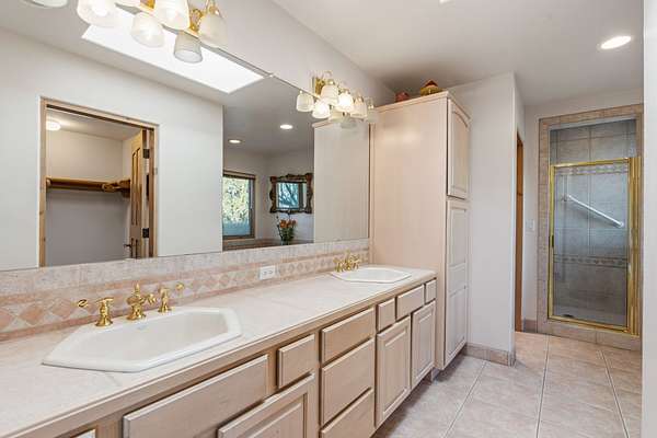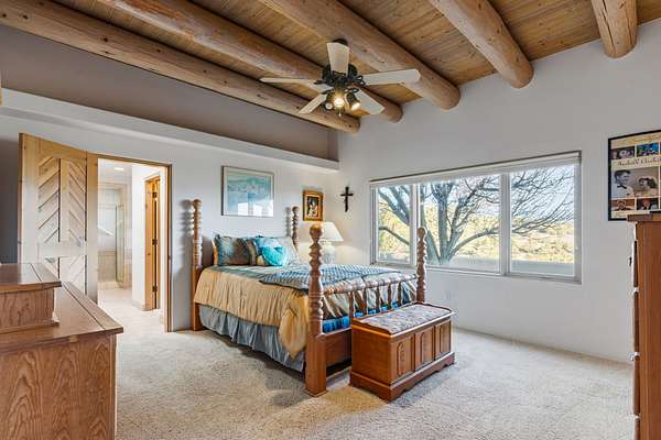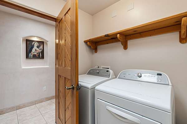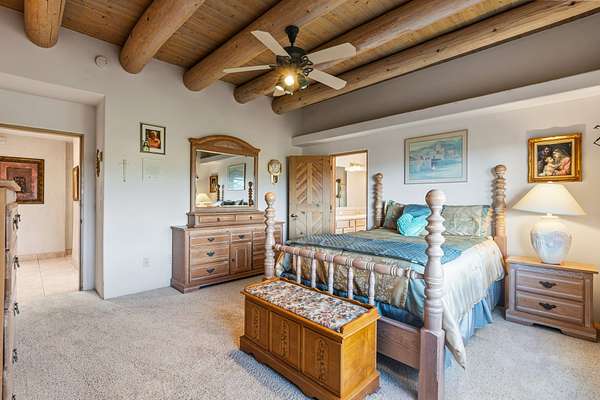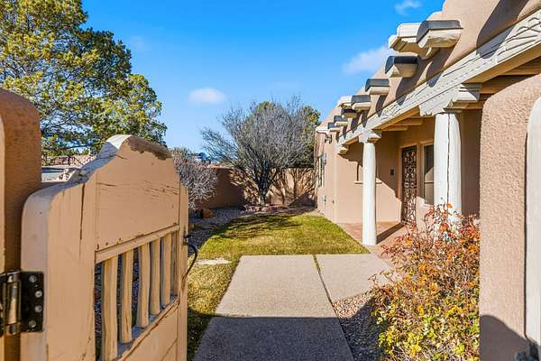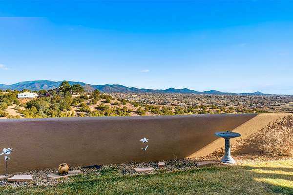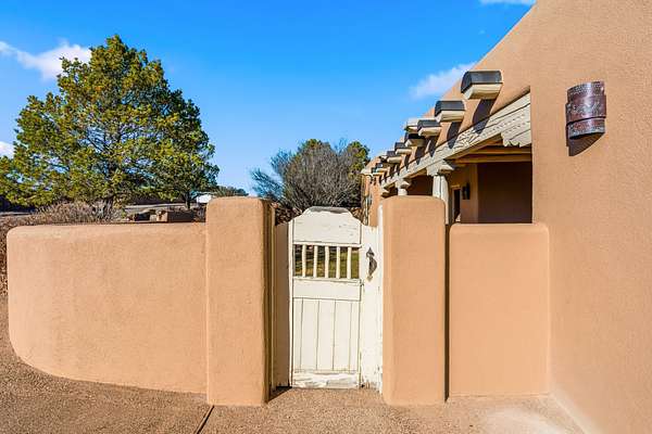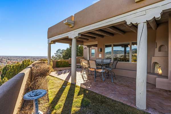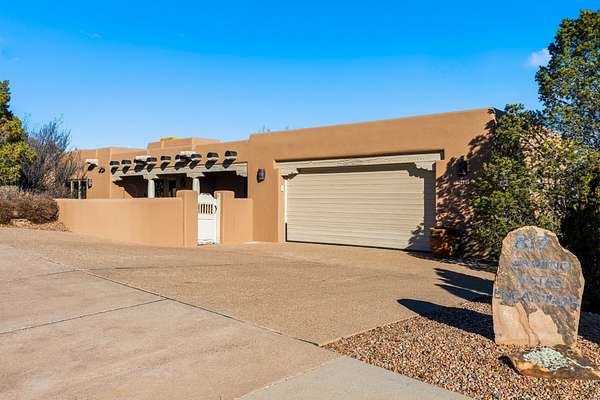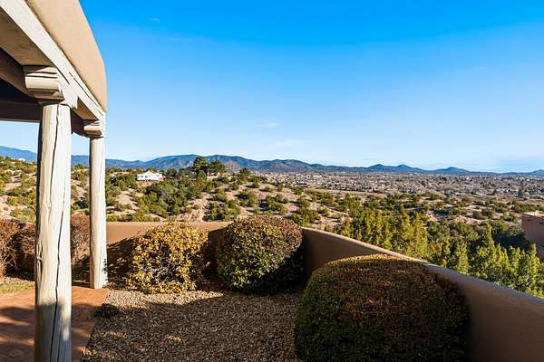 Perched atop a 1.51 acre ridgetop lot overlooking the sparkling lights of Santa Fe and views of the majestic Sangre de Cristo mountain range, this stunning Pueblo style residence captures the best of northern New Mexico living. Thoughtfully crafted with exquisite attention to detail and enhanced by recent upgrades, this 3-bedroom 2.5 bath home offers both timeless elegance and modern comfort. Step inside to discover diamond finish plastered interior walls, blue spruce tongue and groove ceilings with vigas, hand carved pine beams, and warm Italian tile floors that flow throughout the light filled interior. The spacious living room is graced by soaring 12-foot-high ceilings and a traditional kiva fireplace that opens to a formal dining room showcasing spectacular views. The chef's kitchen features custom maple cabinetry, built in appliances including a cooktop, oven and microwave, recessed lighting and Italian tile countertops is perfect for entertaining or quiet evenings at home. The primary suite offers serene privacy with dual sinks, a linen closet and a luxurious whirlpool tub while each closet in the house boasts custom built shelving. Distinctive architectural touches such as wood carved beams, lighted niches, copper wall sconces and pendants, solid brass bathroom fixtures, and knotty pine doors add rich texture and authenticity throughout. Enjoy the ambiance of two kiva fireplaces including one in the main living area and one on the covered outdoor patio. Outside, beautifully designed front and rear walled courtyards frame a fully landscaped yard accented with colorful shrubs, mature trees and lush grass nourished by a full sprinkler and drip irrigation system. Expansive covered brick porches provide the perfect space to relax and soak in sunset vistas. Additional highlights include new exterior stucco, aluminum wood clad Pella windows and exterior doors, a central radio and intercom system, custom wrought iron security screen doors, a new front gate, a finished and insulated 2 car garage with a cedar door, and numerous skylights that invite natural light into every space. Excellent midtown location in the highly sought after Sierra del Sol subdivision - an area of custom homes with paved roads and easy access to all of Santa Fe's amenities. From its refined craftsmanship to its breathtaking views, 817 Camino Vistas Encantada embodies the quintessential Santa Fe lifestyle - warm, inviting and undeniably enchanting.