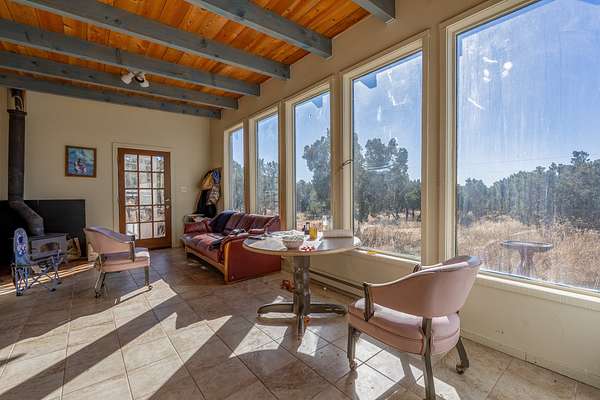 Experience tranquility in this enchanting Arroyo Hondo property featuring a beautiful three bedroom main home and a separate one bedroom casita complete with its own kitchen and bath. The home's flowing layout creates a sense of balance and connection throughout with the application of harmonius Feng Shui principles. The spacious open kitchen with a dining area and wood-burning fireplace serves as the heart of the home, an inviting space to gather and enjoy. Two bedrooms and two bathrooms are conveniently located just off the kitchen. A large family room with two additional fireplaces opens to flexible living space, ideal for an office or studio. The private primary suite offers a serene retreat with a full bath and quiet separation from the main living areas. Step outside to take in breathtaking surrounding mountain views from multiple outdoor patios and sitting areas, perfect for relaxation or entertaining. The property is horse friendly and includes a new heated yurt, ideal for creative pursuits or guest accommodations. A truly magical property awaits you just ten minutes from downtown Santa Fe.