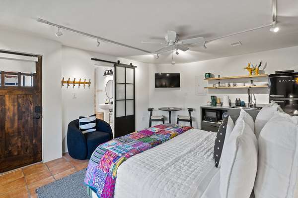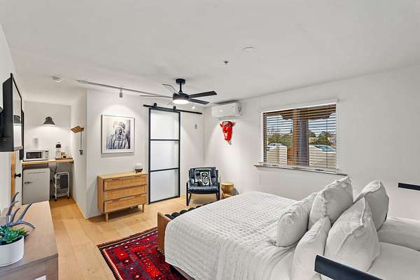 Turnkey Arts + Residential Investment Opportunity in Eldorado. Offered at $1,750,000 with a current 5.5% CAP rate and projected 7.7% CAP rate for 2026, this extensively renovated 4,815 SF mixed-use property sits on 2.09 acres with direct access and high visibility along U.S. Highway 285, a major corridor carrying an estimated 30,000-55,000 vehicles daily. The building is currently home to the Jen Tough Gallery and includes five contemporary short-term rental apartments and four private art studios, all designed for visiting artists seeking one-week to one-month residencies. This turnkey creative campus has generated approximately $8,000 per month in actual income, with nearly 80% of 2026 already booked and a projected 2026 income of approximately $14,000 per month. The property offers multiple revenue streams through short-term lodging, studio rentals, and gallery events. The 2.09-acre site provides exceptional parking, signage exposure, and future expansion potential for additional studios, casitas, or outdoor sculpture gardens. Seller financing is available to a qualified buyer, adding flexibility and attractive entry into Santa Fe's thriving arts, hospitality, short-term rental market, boutique hotel, and potential restaurant space.
