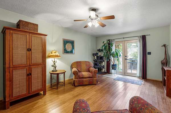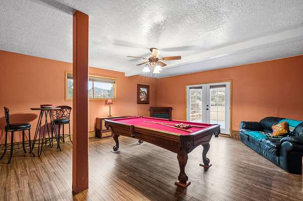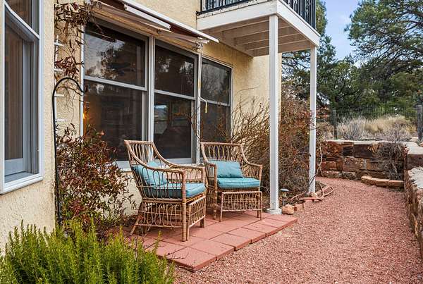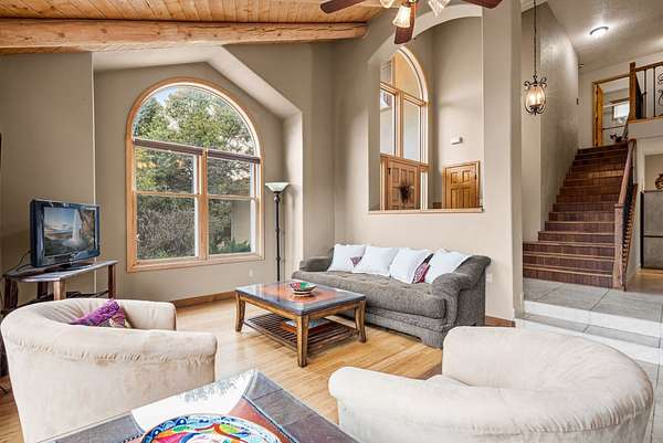Set on more than five wooded acres just 20 minutes from the historic Santa Fe Plaza, this Spanish-style retreat offers rare privacy, expansive views, and the feeling of owning your own secluded oasis while remaining close to town. Elevated above the road and surrounded by native pinon, pine, and cedar, the property enjoys rolling terrain, endless skies, and sunsets that glow in gold and crimson before giving way to brilliant, star-filled nights. The setting is peaceful, immersive, and grounding. Inside, natural light pours through generous windows, illuminating soaring ceilings and open living spaces that feel both grand and inviting. Warm wood and tile flooring, iron accents, and timeless architectural details reflect authentic Spanish character. The beautifully refreshed kitchen anchors the home, offering generous space to gather, cook, and entertain with ease. Upstairs, spacious bedrooms provide comfort and privacy, including one with a balcony set among the trees. The primary suite serves as a private sanctuary with a deep soaking tub and oversized shower for a spa-inspired experience. A detached studio offers flexibility for guests, creative pursuits, or a home office. Outdoors, enjoy curated landscaping, a tranquil pond, covered patio with traditional horno, and fenced space for pets. Offering land, light, views, and proximity, this is Santa Fe living at its most serene, a rare opportunity to experience space, beauty, and quiet connection to nature just minutes from the Plaza.