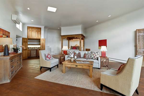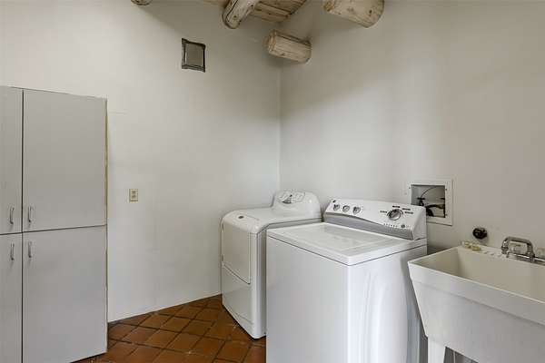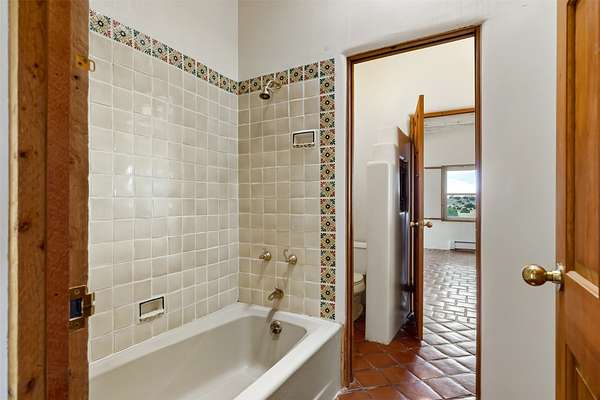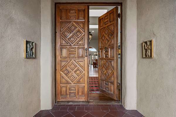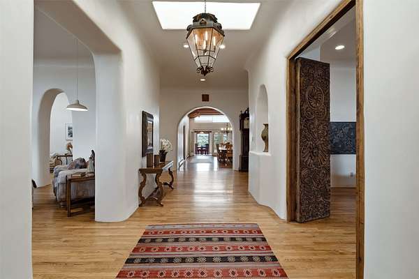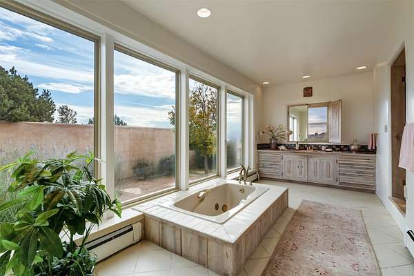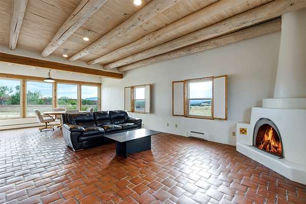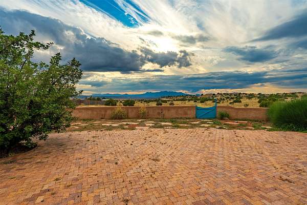 In the quaint village of Galisteo lies this gracious and majestic home with adjoining 5 acre lot, for a total of 10 acres, known as 'Hacienda del Sol." One hundred years ago was the site of the Old Galisteo School House. The original 1886 bell and corner stone 1938 were placed within the walls of this present day home. Built atop a gentle hill with stunning views of the Galisteo Basin, Sangre de Cristos and Jemez Mountains along with huge white puffy cloud formations in a brilliant blue sky greet you everyday. Large rooms with cathedral ceilings flooded with light, sculptured fireplaces, oak and pine floors with 10 foot elegantly carved doors delight the eye upon entering. Screened in, is a lovely outdoor patio with vast, distant views. A gallery hallway runs the length of the house craving art, paintings, photographs, memorabilia. A chef's kitchen with a six burner stove, center islands, prep sinks has everything one would want. An elegant dining room with arched walls, subtle lighting, and carved cabinets allow for many guests or small intimate settings. Three Bedroom suites each with fireplaces and luscious bathrooms are perfectly placed for privacy. An attached "casita" with kitchen and bath is off one of the wings of the home. Outside, there is a circular, walled patio area for summer gatherings and moon lit nights. Included in this fabulous property is a blue gate opening up to an adjoining 5 acre parcel of vacant land accessed off of Camino San Cristobal used for pleasure or as additional acreage for another home, studio, horses, and imagination. Dream on...
