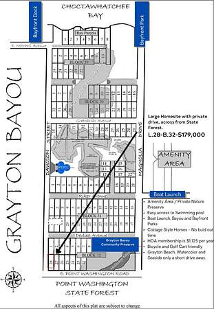 Grayton Bayou is located only 5 minutes north of Grayton Beach. Pt. Washington State Forest views across the street. These streets are lined with Palm Trees & Oak's. This homesite has the Private Drive / Alleyway access.. This homesite is one of the ''full size'' homesites and has room for a main house and a carriage house. Grayton Bayou min. house size at least 1600 sq. ft. with a florida cottage design. Neighborhood has large swimming pool with waterfall, boat launch at end of Riker Ave., bay front park on E. Mitchell. Property is beautiful and wooded, new homes being built all around. Sold 'AS IS''