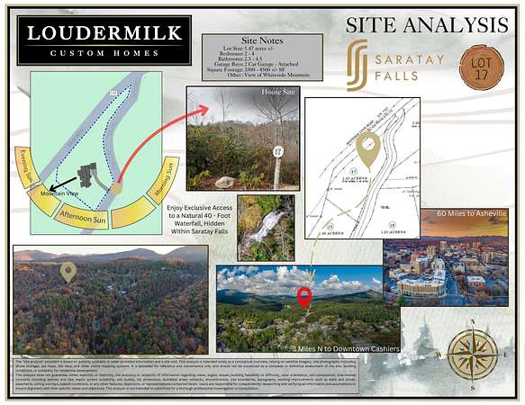 Discover an exceptional opportunity to build your dream mountain retreat on Lot 17 in Saratay Falls, a premier gated community ideally located between Cashiers and Highlands. Encompassing 1.47 acres, this gently sloping homesite offers a highly desirable and easily accessible build site, perfectly positioned to capture stunning views of Whiteside Mountain-one of the most iconic vistas on the Plateau. Saratay Falls is an exclusive enclave of just 20 luxury homesites, thoughtfully designed to blend mountain-modern architecture with the natural beauty of the surrounding landscape. Residents enjoy a private setting surrounded by old-growth forests, along with community features including a spectacular 40-foot natural waterfall, gathering spaces, and outdoor amenities designed to embrace the mountain lifestyle. This homesite offers the rare advantage of building with Loudermilk Custom Homes, an award-winning luxury builder known for exceptional craftsmanship, innovative design, and a highly transparent building experience. With a focus on quality materials, modern mountain aesthetics, and cutting-edge smart home integration, Loudermilk delivers a seamless process from concept through completion. Whether you're seeking a full-time residence or a refined mountain getaway, Lot 17 provides the perfect canvas to create a legacy home in one of Cashiers' most sought-after communities.