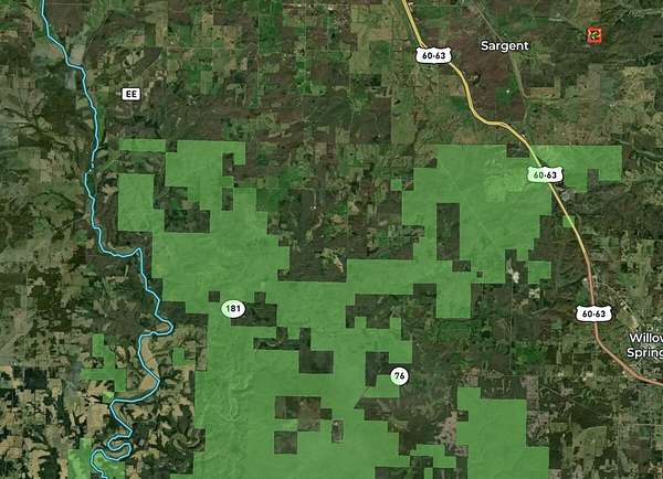 From Cabool, go east on Hwy 60. Left Turn on Hwy AV (gas station there). Road will turn to gravel and be called Colburn Road when you cross railroad tracks. When Colburn Rd T's, turn right onto Sargent Road. Property 1.8 miles on your right.