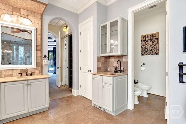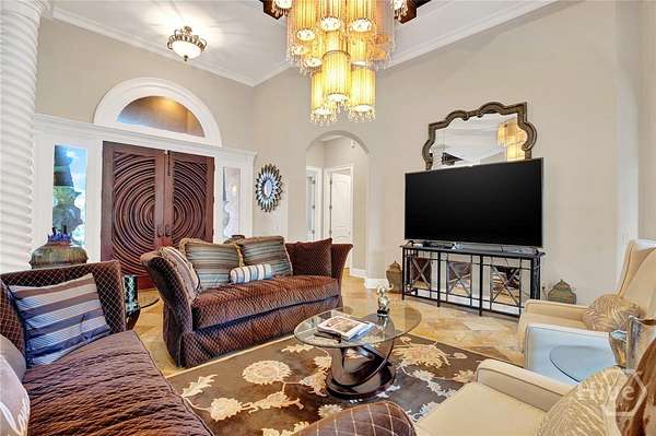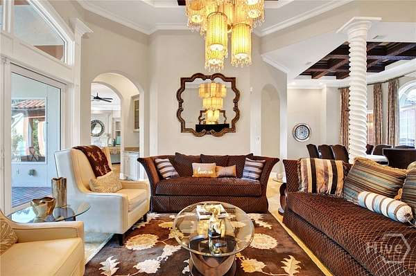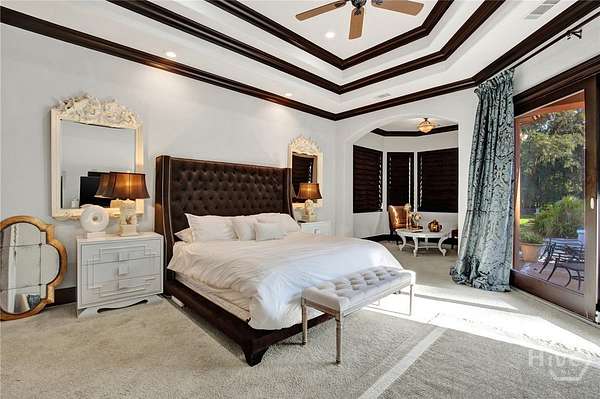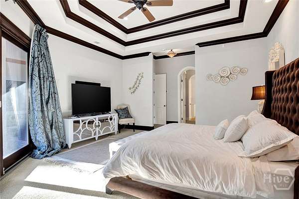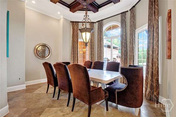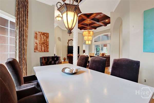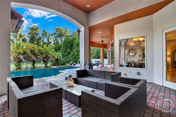 Spanish-style estate on 2.5 private acres in The Estates on Grove River with access to a deepwater community dock on the Little Ogeechee River. This 5BD/4.5BA custom villa offers 5,292+ sq ft of refined living space, including a gourmet kitchen with wet bar, spacious living areas, and home theater with surround sound and blackout curtains. Hand-carved 12' French doors welcome you into a grand foyer filled with natural light. The owner's suite features a steam shower, jacuzzi tub, walk-in closet, and direct access to the infinity pool. Two additional bedrooms offer en suite baths, one with private pool access and cabana-style setup. A fully equipped in-law suite sits above the 3-car garage. Enjoy a serene and spacious wooded setting, fenced yard, and community dock access--all just minutes from Savannah. Exceptional craftsmanship, privacy, and luxury combine in this one-of-a-kind coastal retreat. On behalf of our Seller, we are pleased to offer a Buyer Broker Compensation of 2.4%.