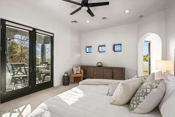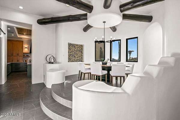 A Masterpiece of Contemporary Pueblo Southwestern Design. This modern stylized Pueblo has been expertly fully remodeled keeping the authenticity and sophistication of the style as well as furnishing the home with the high end finishes and features of today's casual indoor outdoor lifestyle. This impressive home, with separate guest home with sport court, is nestled at the base of the McDowell Mountains in the exclusive gated community of Canyon Heights in North Scottsdale. The elevated 1.57 acred homesite magnifies the inspiring Southwestern views including down Valley views of Camelback Mountain, colorful sunsets and twinkling city lights. A striking fusion of curves and angles defines the home's architectural beauty-arched doorways and corridors, curved walls, stylized kiva fireplaces, and expansive glass elements harmonize to bring the outdoors in. Freshly painted inside and out, the smooth walls exude warmth, while bold black accentsseen in Vigas, doors, and fixturesadd contemporary contrast. The double gated circular driveway leads to this sublime property set back amongst lush Sonoran Desert vegetation. Upon entry the flowing floor plan includes the ideal living room with numerous windows capturing the incredible views and the dining room connects through an arched corridor with additional windows and stunning kiva fireplace. A barn-doored office offers privacy and also serves as the gateway to the separate guest house. The new gourmet kitchen is a chef's dream, showcasing the finest cabinetry, a spacious island, sleek stone countertops, and top-tier appliances. A welcoming den with circular casual dining space, pool table space and a built-in bar invites hours of relaxation and seamlessly extends to an outdoor dining patio with yet another kiva fireplacean idyllic setting to savor city lights beneath a starry desert sky. Designed for both relaxation and grand entertaining, the resort-style backyard is a true desert oasis. An inviting lagoon pool and spa are accented by natural boulder water features, while two lush lawn areas add vibrancy and contrast to the desert landscape. Expansive outdoor living and dining spaces provide the perfect setting for enjoying the captivating views in ultimate privacy. Whether hosting an intimate gathering or a lively soiree, the seamless indoor-outdoor flow ensures a lifestyle of effortless elegance. The expansive primary suite is a private sanctuary, complete with a media room entrance, a floor-to-ceiling fireplace, and direct access to a serene balcony patio offering another perspective of the inspiring vistas. The spa-inspired bathroom presents double vanities, a custom-designed wet room with a freestanding tub, and an open-concept shower. A show-stopping walk-in closet completes this luxurious retreat. For unparalleled guest comfort, separate quarters offer a private den with outdoor access leading to the lower lawned yard, as well as access to the pool patio. The two well-appointed ensuite bedrooms, each with new lavish ensuite baths and walk-in closets guarantee comfort. An additional ensuite bedroom, on the main level, ensures ample space for overflow guests. The detached guest home is a remarkable extension of this estate, offering self-sufficient living with a full kitchen, spacious den, a bath with a steam shower, and a private outdoor patio. The show-stopping 1200 sqft sport court provides endless entertainment, from basketball and ping pong to hockey, fitness and beyond. Tucked away in a tranquil, private setting yet mere minutes from upscale shopping, dining, and the vibrant energy of the Valley, this estate embodies the pinnacle of Sonoran Desert living. Offering privacy, breathtaking views, and seamless indoor-outdoor living for both intimate gatherings and large-scale entertaining, this modern Pueblo masterpiece is truly one of a kind. Your dream desert retreat awaits.