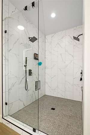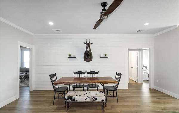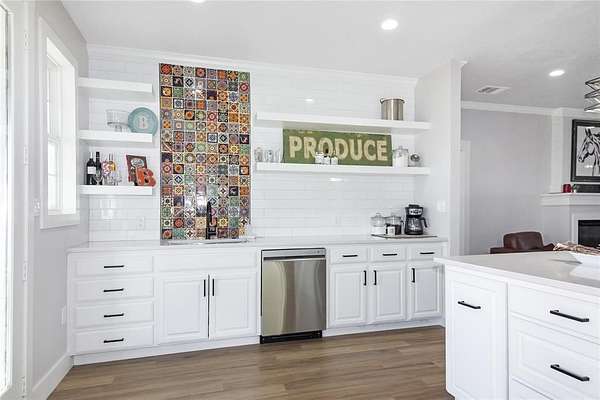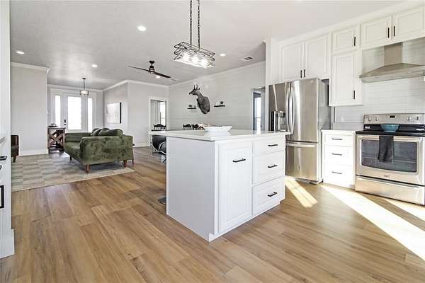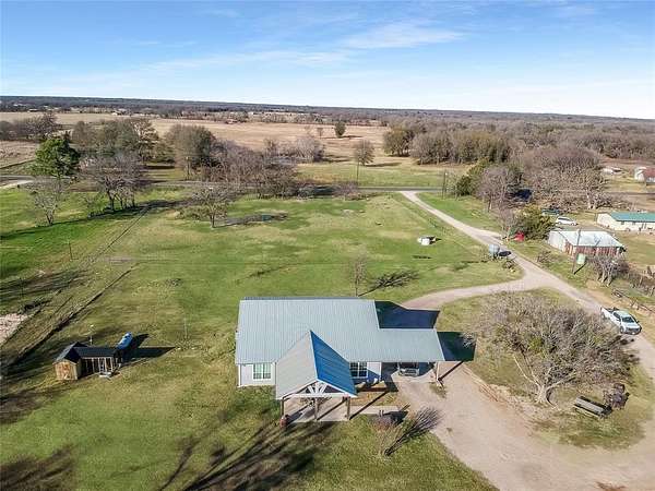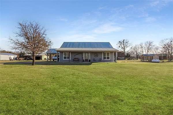 Beautifully remodeled 5-bedroom, 3-bath home on 5 cross-fenced acres in Scurry, TX, located in Kemp ISD with a pond! Built in 2015 and completely move-in ready, this 2,068 sq ft home offers space, flexibility, and functionality ideal for large families, multi-generational living, or those needing rooms for a home office, gym, playroom, or hobby space. The inviting entryway opens to a bright, open living area featuring laminate wood flooring throughout and a cozy ventless propane fireplace. The dining area showcases a charming white shiplap accent wall, while the kitchen is a true standout with refinished white cabinets, new quartz countertops, a two-seat eat-in island with drawers, outlets, and a trash pull-out, mosaic tile backsplash, and abundant natural light from large windows and glass double back doors. The split layout provides privacy and versatility. One side of the home features three bedrooms and a full bath. The opposite side offers an additional bedroom with a full bath and the spacious primary suite. The primary bedroom includes room for a sitting area and leads to a spa-like bathroom with double vanities, a large walk-in closet, an added linen closet, and an impressive oversized walk-in shower with dual shower heads. Recent upgrades include new flooring, paint, trim, fixtures, switches, doorknobs, keyless entry on front and back doors, refinished cabinets, new tile and backsplash, quartz countertops, and fully remodeled primary and shared bathrooms with custom cabinetry, tile, and glass. Outside improvements are equally impressive: a rustic 16x18 barn used as an office-man cave, pre-plumbed for a bathroom; a 30x70 insulated show barn with mini-split AC-heat, tankless water heater, washer dryer hookups, shop sink, five stalls, three roll-up doors, two man doors, separate electric meter, and bathroom plumbing in place; plus a 60x60 pole barn with half concrete, ideal for a future MIL suite, apartment, or pool room.