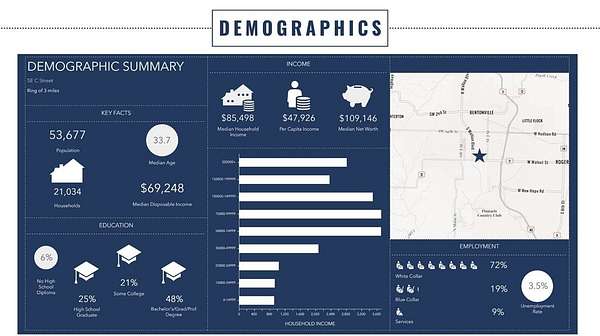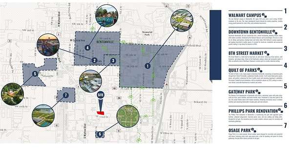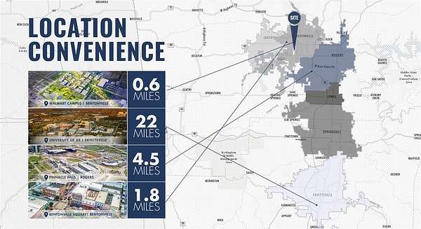 - Zoning allows for multifamily and/or commercial - 0.6 miles to the new Walmart campus - 1.8 miles to downtown Bentonville - Utilities available - Level lot ready for development - Easy access to S. Walton Blvd & I-49 - C-2 Zoning - Adjacent 5 acre parcel to the north is a protected nature preserve.