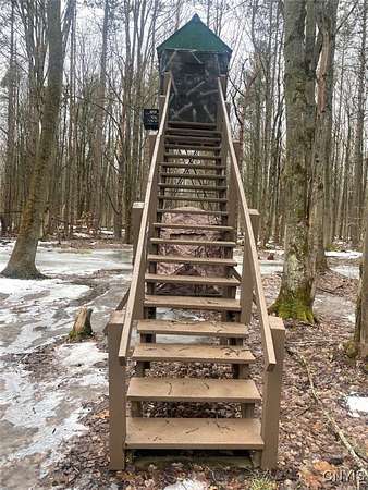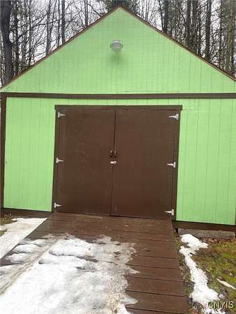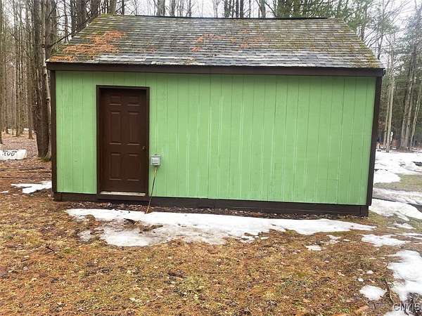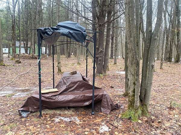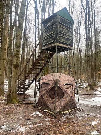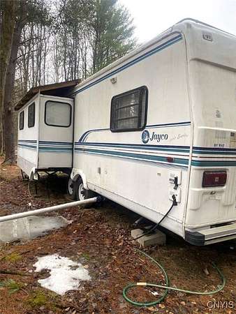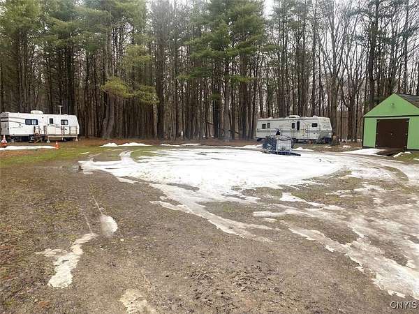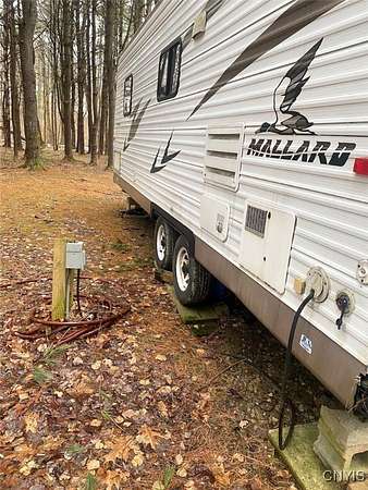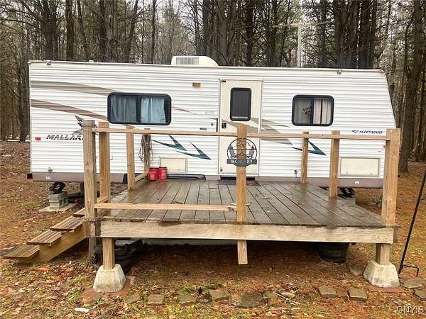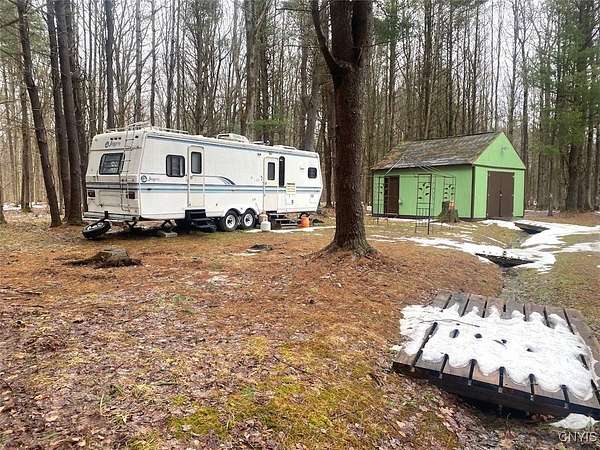 This recreational property consists of two campers with electric on 4 acres located in Belfast NY, Allegany County. Tucked away for privacy, this secluded property is a great spot for get-togethers, camping, and outdoor recreation. Access is provided by a deeded easement off a town road leading to a well set-up retreat with electric and water already on site. A clean, well-kept outhouse adds convenience for extended stays. Two travel trailers in good condition are included, with a pressure treated deck already set up on one camper for comfortable outdoor space. A large storage shed provides plenty of room for tools and equipment, with space for an ATV and lawnmower. The land offers a mix of softwood, hardwood, and pine trees, along with a large enclosed hunting blind and a shooting lane already set up for target practice. Surface rights convey and an existing survey is available. Located just a short drive from state land, this is a practical option for anyone looking for a quiet family camping getaway.