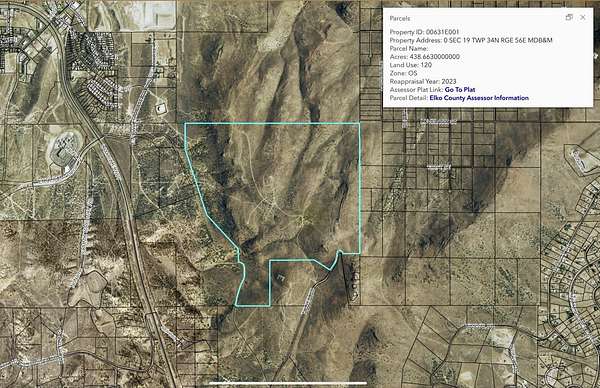 Extraordinary Development Opportunity: 438.663 Acres of Prime Land. Attention developers and privacy seekers! An extraordinary opportunity beckons with this 438.663-acre blank canvas, a developer's dream nestled in a prime location close to the City of Elko. Envision the potential for a residential community, commercial venture, or mixed-use development on this expansive parcel.Strategically positioned for success in a burgeoning market, this land offers ample space and endless possibilities. Don't let this chance slip away to shape the landscape of this thriving area with your visionary project. Discover the remarkable potential of this pristine land and make your mark in this growing community.Your Oasis awaits, ready to become the cornerstone of future development in the area. Seize the opportunity to leave your mark with this ideal 438.663-acre development site! Key Features Expansive Size: 438.663 acres of developable land. Prime Location: Conveniently located by the City of Elko Natural Beauty: Rolling hills, lush trees, and captivating city views Versatile Potential: Ideal for residential, commercial, or mixed-use development Thriving Community: Positioned for success.