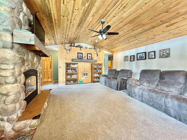 Welcome to 189 Timberlane. This lovely 3-bedroom, 2-bathroom, single-level home has everything you might need. Located in Double Arrow Ranch Phase II, you are close to town, and just off the paved roads. The home has a bonus room that could be used as an office for those wanting to work from home, or hobby room, or whatever your needs might be. The great room and owner's suite have vaulted tongue and groove blue pine ceilings. You have your choice of heating sources with the river rock fireplace being set up for gas, and a wood stove, also in the living room. There are also supplemental electric heaters throughout the house. The kitchen is complete with a storage pantry, custom hickory cabinets and flooring. The dining room offers access to the expansive 16'x20' covered deck, perfect for outdoor dining or simply relaxing. Trees have been thoughtfully planted surrounding the deck to add to the private feel. A paved driveway leads you to the attached two-car garage which brings you into the tiled floor laundry room. Outside, you'll find the detached and versatile 24'x32' heated shop with lean-to, giving you ample room to store your Montana toys. Attached to the rear of the shop is a 12'x12' shed for additional storage. Across the drive from the shop is a gravel parking pad, and on the south driveway, you'll find an RV parking spot with hook-ups. This area of the ranch is one of the most level and also parklike. The rear yards of the neighboring homes adjoin each other making this homes yard feel expansive. It also feels very private because the neighboring homes to the west sit below a bench and it feels like they aren't even there! Seeley Lake Water District Bond debt service of $32.72 per month until approximately 2029.