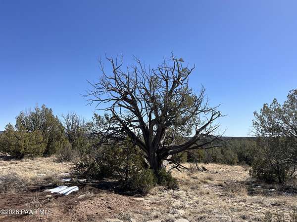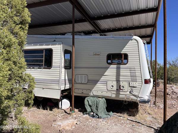 This 2.67 Acre parcel is ready for you to come and enjoy. A HUGE RV cover has already been professionally installed, and there's plenty of room to roam, with the west boundary of this parcel being adjacent to 640 acres of State Trust land. There's a driveway with two cleared areas already cut-in. 100 gallon propane tank for the stove and new hot water heater do convey. 5th wheel also conveys and is live-able now, with a small water tank for deliveries with a solar system set up for pressurized water. Come and enjoy your glamp-site in the wilderness today!