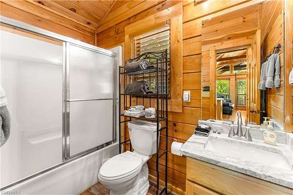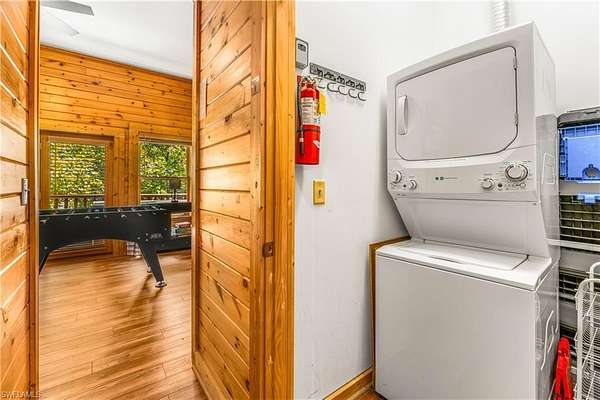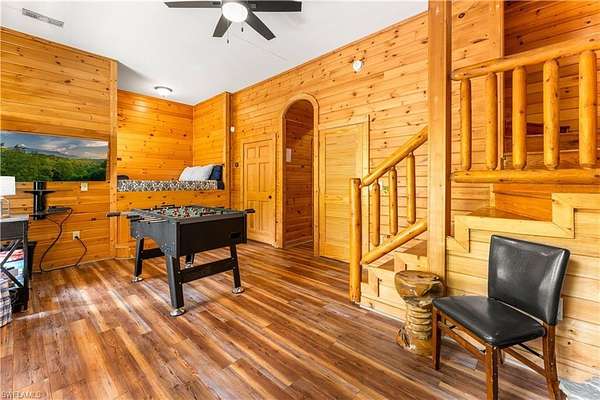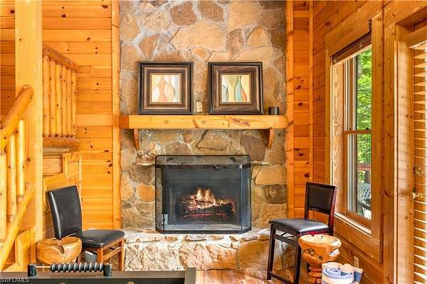 The 1,240 sq. ft. cabin features soaring cathedral ceilings, exposed wood beams, a dedicated laundry room, and two gas fireplaces--one on each level--both equipped with timers for convenience and efficiency. Rare Black & Yellow Oak floors, milled from a 150-year-old tobacco barn, add timeless character and warmth throughout. Each level offers a private bedroom and full bath, plus a short queen bed in the game room for guests.