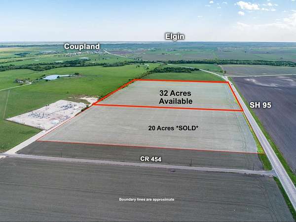 Presenting an exceptional investment opportunity in booming Williamson County! 32 acres of mostly unrestricted cropland with approx. 1,200 feet of highway frontage on SH 95. The property's location is ideal for industrial development or as a buy-and-hold investment in the path of exponential growth. The rectangular and level tract currently has a farm lease and produces row crops. Approximately 8.5 acres along the highway frontage is within Coupland city limits in zone A-5 for agricultural land that can potentially be rezoned. The remaining acreage is unrestricted. There is no surface water or floodplain. No mineral rights. Oncor Electric and Manville Water Supply Corp service the area. New meters are needed, along with septic. Agricultural valuation, Williamson County, Taylor ISD. Taxes are approx. $524. 1.4 miles north of Coupland on the east side of SH 95 near the intersection of FM 1660. 5.2 miles to US 79 in Taylor, 7 miles to Samsung Semiconductor, 9 miles to Elgin, 15 miles to Manor, 20 miles to Round Rock, 29 miles to downtown Austin, 16 miles to Austin Executive Airport, 30 miles to Austin-Bergstrom International Airport.
