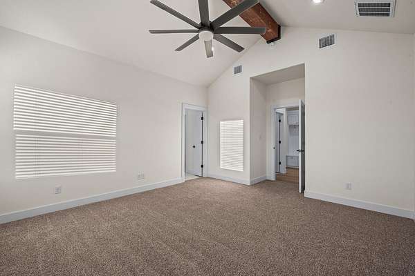 - Beamed Ceilings, Built-In Features, Cathedral Ceiling(s), Ceiling Fan(s), Chandelier, Double Vanity, High Ceilings, High Speed Internet, Kitchen Island, Open Floorplan, Quartz Counters, Recessed Lighting, Walk-In Closet(s), Wired For Data