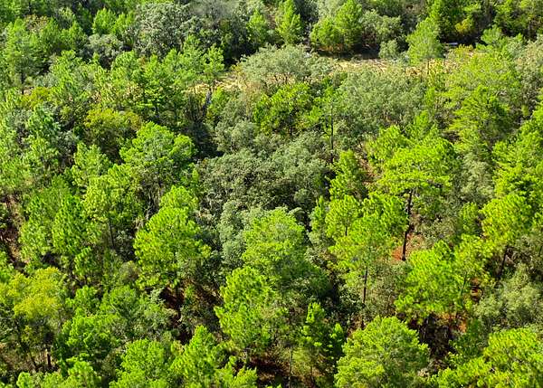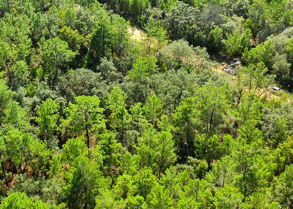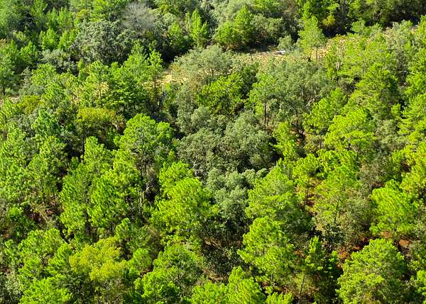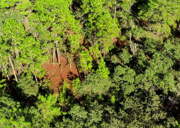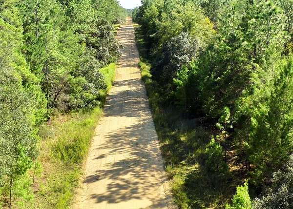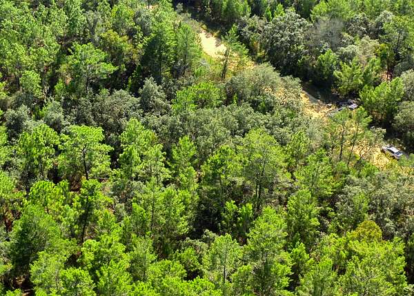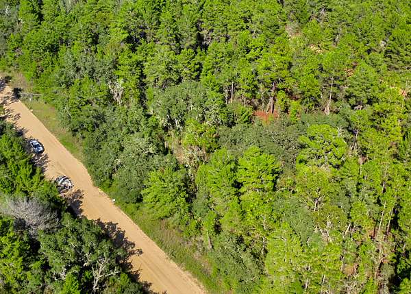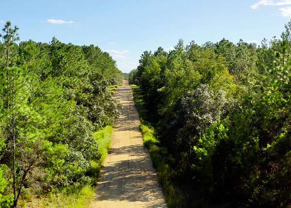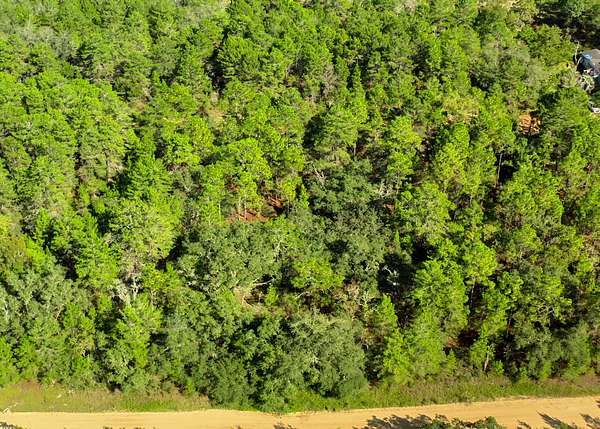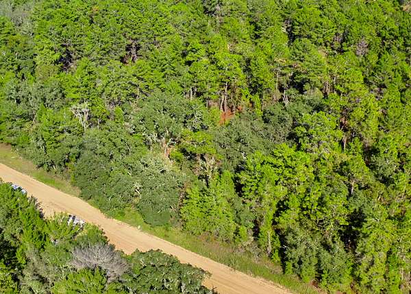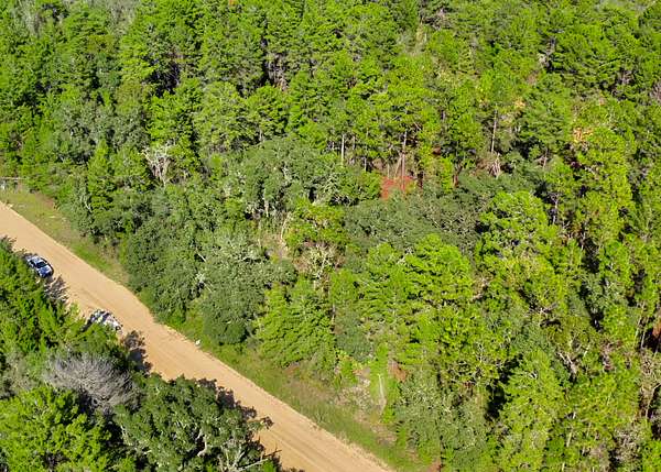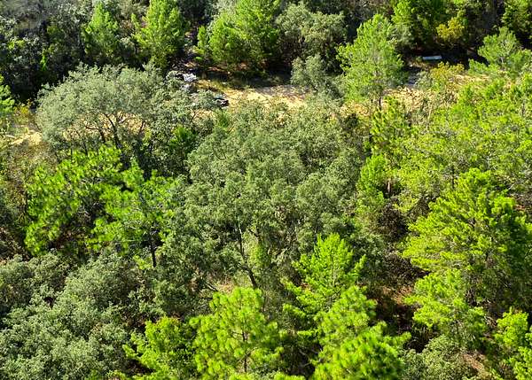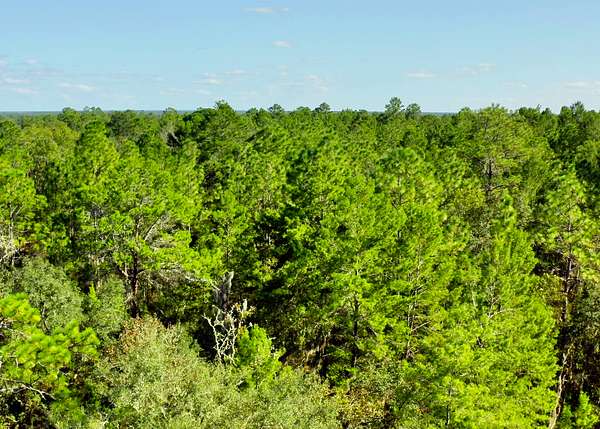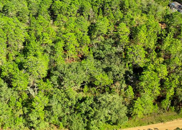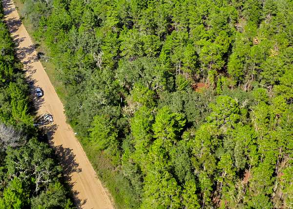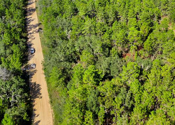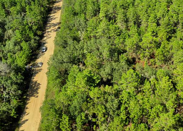 The property features gently sloped terrain with a mix of pine flatwoods and patches of grassland, offering natural shade and greenery.