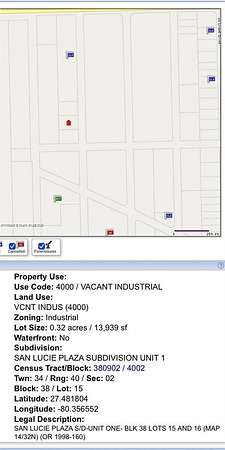 Est $794/moFind your slice of paradise on this beautiful & private VACANT INDUSTRIAL, 0.32 acres / 13,939 sf. It is conveniently located just minutes from St.Licie BLVD, W.Dixixe BLVD, Downtown, Farmers' Markets, Piers, and schools. With easy access to I-95 and plenty of shopping and restaurants on Okeechobee Road, this location offers convenience and accessibility. Less than a mile from US-1, providing easy access to Hutchinson Island