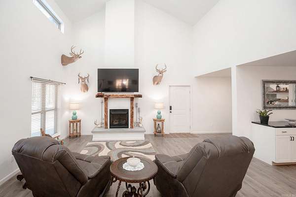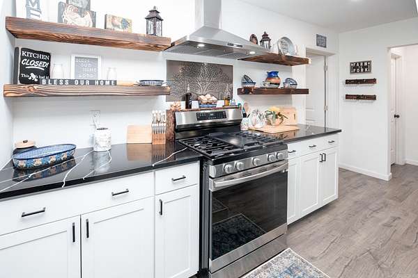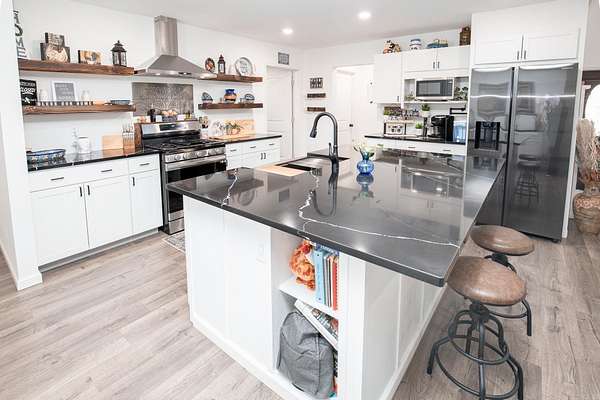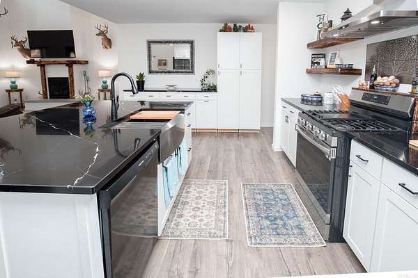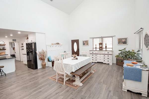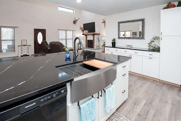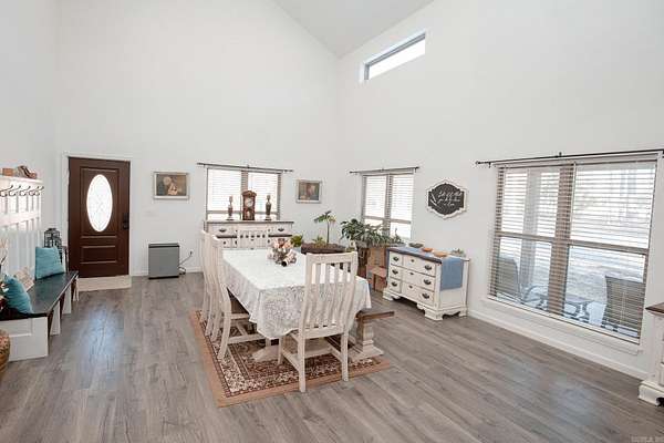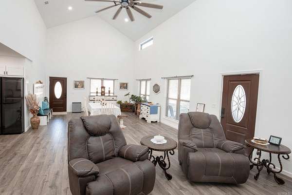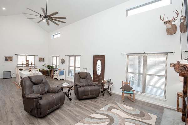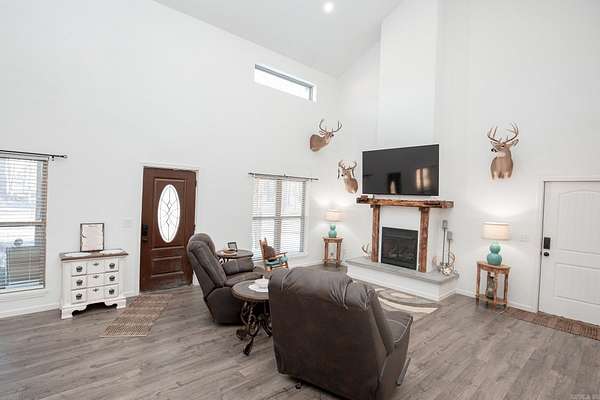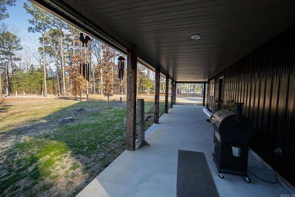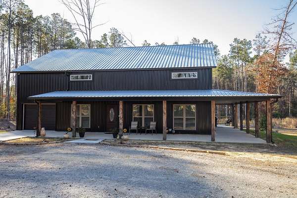Welcome to your dream Barndo on 5.17 acres! This custom home offers 3,760 sq ft of heated and cooled living space plus garage area, all sitting on a 40x50 slab and stick built with 2x6 framing and durable metal siding. Inside you'll find 3 bedrooms, 3 full bathrooms, an office and 2 bonus areas. The primary suite is downstairs along with an additional full bath for guests. Office space, walk in pantry and laundry are downstairs also. Upstairs features 2 bedrooms (walk in closet) and a bathroom with two bonus room areas (with closet) The kitchen was designed to impress with black granite countertops, farmhouse apron sink, touchless faucet, stainless vent hood, gas stove, and a large walk-in pantry with room for freezers. Enjoy cozy evenings by the natural stone gas fireplace with concrete hearth. Built for efficiency and comfort, this home includes spray foam insulation, separate controlled upstairs HVAC with built-in humidifier, gas tankless water heater, and a wired commercial-grade security system. Relax on the wraparound porch supported by beautiful Douglas fir posts and enjoy peaceful country living just minutes from town. The 1-car garage/shop space adds flexibility