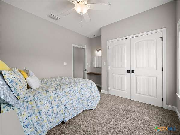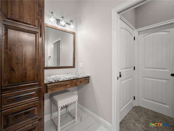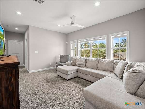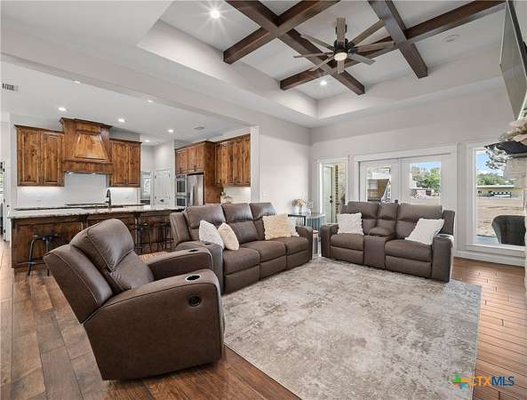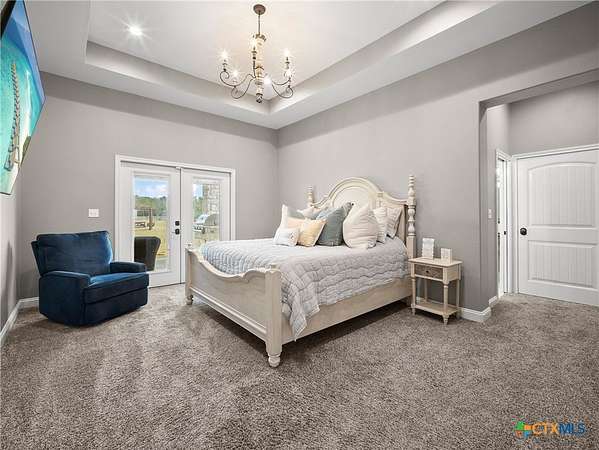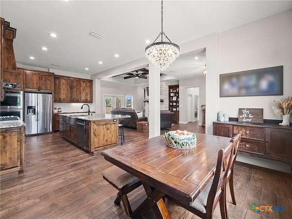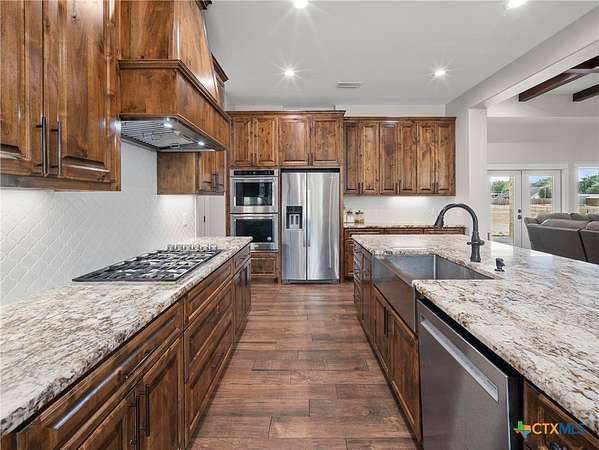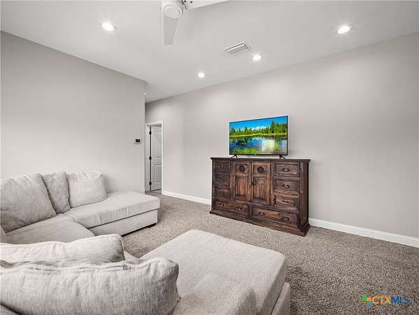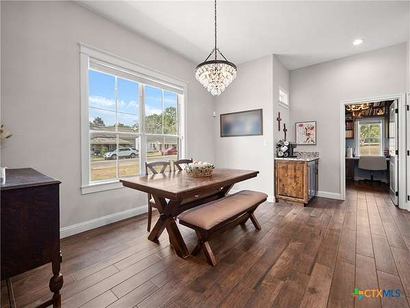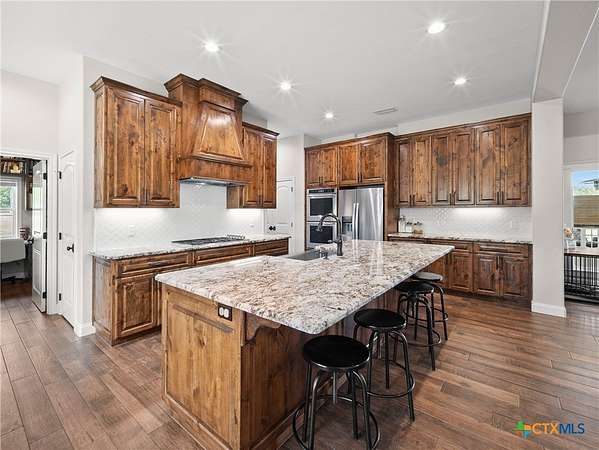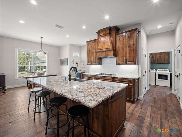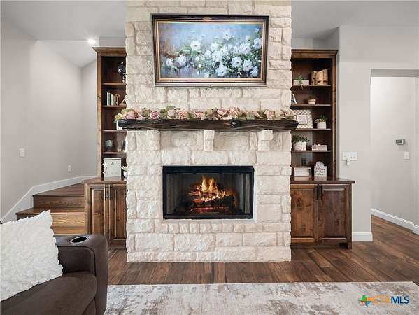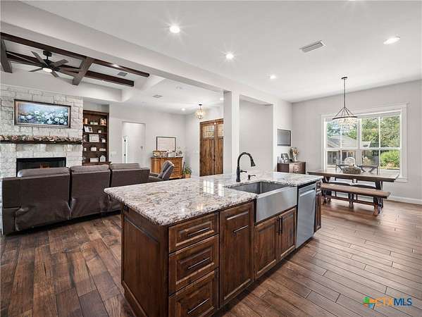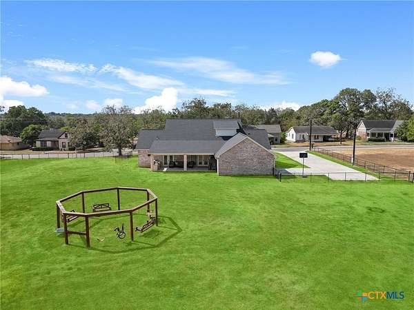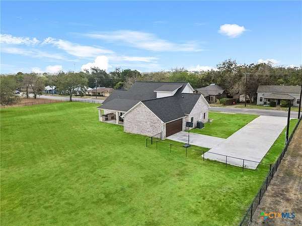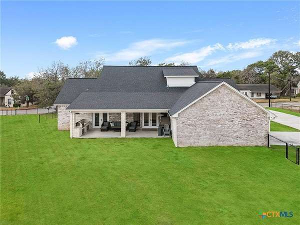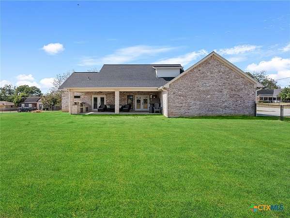 Traditional custom limestone home by Mraz on a 2 acre lot in central Shiner. Features rich knotty alder cabinetry, dark ceramic wood-like tile, granite countertops, & stainless appliances. Creamy warm neutral tones and a limestone hearth with fireplace create a welcoming centerpiece. Thoughtfully designed floor plan includes a butler's pantry, spacious laundry room, and private office. Primary suite and guest bedroom with bath downstairs; two bedrooms, bath, and entertainment den upstairs. Ample storage and natural light throughout. The primary suite offers a spa-like retreat with walk-in shower, double vanities, safe room, & large walk-in closet. Enjoy a covered porch and patio overlooking the fully fenced yard-perfect for pets, with space for a pool, barn, or guest house. Attached side-entry 2-car garage & plenty of parking. Light deed restrictions and a peaceful neighborhood complete this rare Shiner find. Conveniently nestled near parks, tennis courts & local small town amenities.