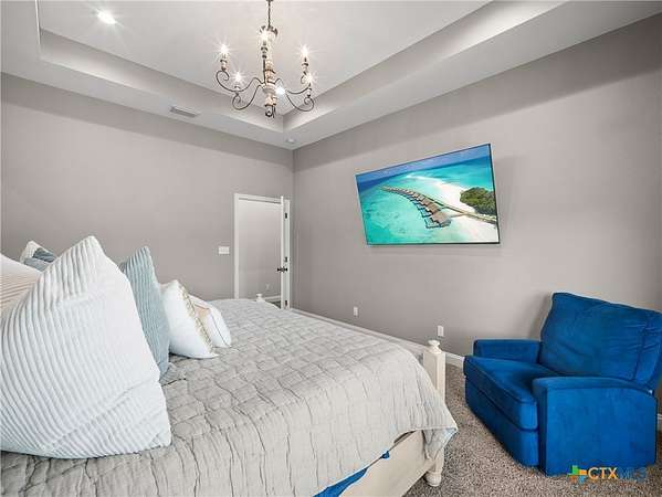- Attic, Breakfast Bar, Ceiling Fans, Coffered Ceilings, Double Vanity, Eat In Kitchen, Entrance Foyer, Game Room, Granite Counters, High Ceilings, Home Office, Main Level Primary, Multiple Living Areas, Natural Woodwork, Open Floorplan, Primary Downstairs, Pull Down Attic Stairs, Separate Shower, Tray Ceilings, Walk In Closets, Window Treatments