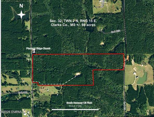 This +/- 98 acre property in Clarke County, MS is approximately 7 miles southwest of Quitman in the Harmony community. With road frontage on county roads 117 and 115, this property has multiple home sites. There is a good access road on the southwest corner of the property that leads to a inactive oil well. 100 % mineral rights are included, The timber consists of +/- 50 acres of 28 year old thinned pines and +/- 48 acres that was site prepped with herbicides and recently replanted. The possibilities for this property are unlimited!
