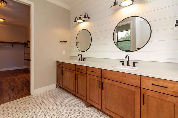 The open-concept design centers around a gorgeous designer kitchen featuring quartz countertops, upgraded cabinetry, warm wood accents, a generous island, and stylish lighting. Wood-look flooring, shiplap details, and premium finishes flow seamlessly from room to room. The primary suite feels like a private retreat, offering a spa-inspired bath with a freestanding tub, walk-in shower with decorative tile inlay, dual vanities, and a spacious walk-in closet.