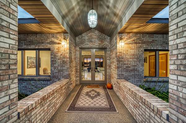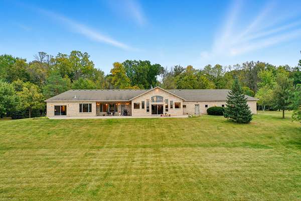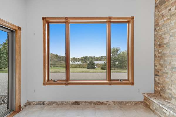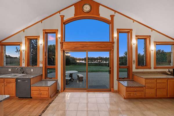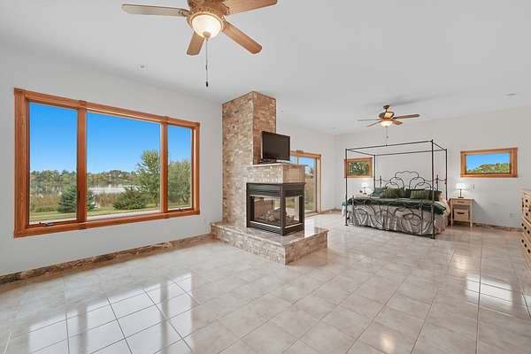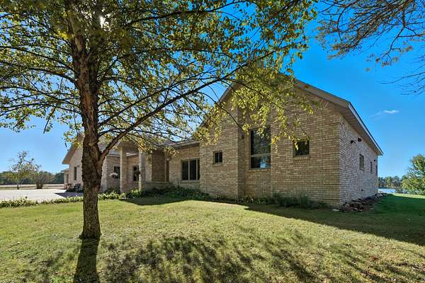 The residence itself is a spacious 4,000-square-foot all brick home, all on a single level, designed with an open floor plan that maximizes natural light and scenic views through oversized windows. The large walk-out patio provides an excellent space for entertaining guests while enjoying the stunning lake vistas. Inside, the home features heated floors throughout, ensuring comfort year-round. The primary suite is a luxurious retreat, complete with a fireplace, walk-through bathroom with his-and-her vanities, large walk-in closets with granite countertops, and a spacious jetted tub for relaxation. Accommodating family and guests, the home includes four bedrooms and ample storage options, all thoughtfully integrated into the well-designed layout. The property is also equipped with a large, welcoming foyer, a cement driveway and apron, and an oversized four-car garage for convenience. For additional storage and utility, there is a 100x50 pole shed with cement floors, overhead lighting, and two large garage doors for easy access. An extra well near the pole shed provides water supply options, while a matching brick storage shed with double doors offers space for lawnmowers, toys, or other equipment, and is wired for a generator, ensuring preparedness for any situation.