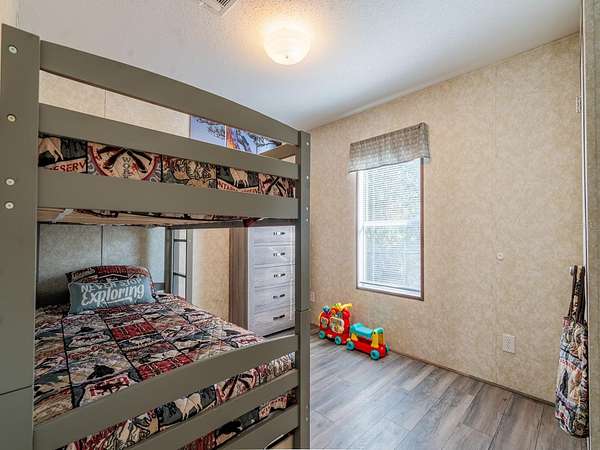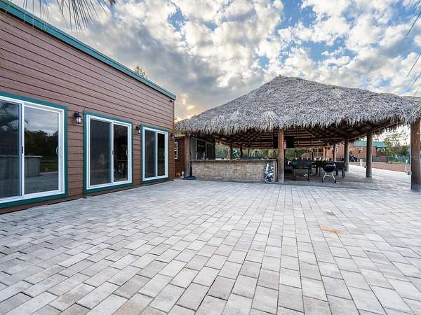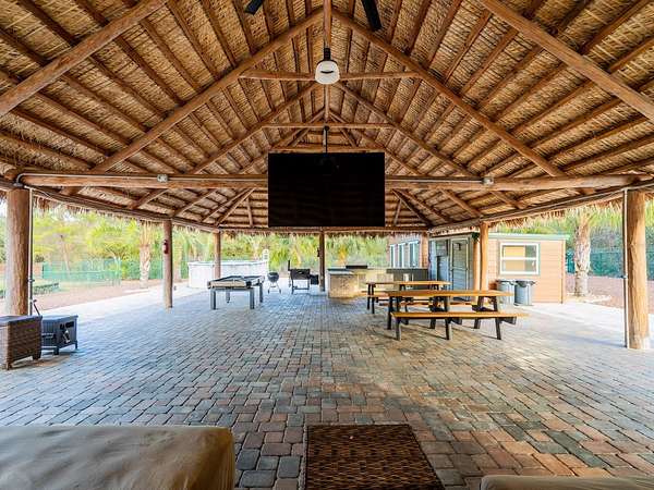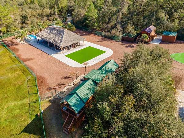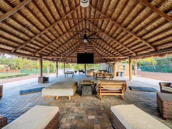At the center of the property is a 2,240 SF tiki hut designed for entertaining, featuring a fully equipped outdoor kitchen with gas burners, granite countertops, a 13'x10' enclosed prep kitchen, storage, large screen TV, lounge seating, oversized fans, and bright lighting. Additional amenities include an above-ground pool, massive Rainbow playground system, and a private pond with liner, stocked fish, and automatic feeders ideal for fishing or paddle boating. A paver gathering area with wood-burning fire pit, beach-style area, and kids' cottage overlooks the pond. Approximately four acres of the main resort area are enclosed with 8' chain-link fencing with concrete footers and barbed wire topping, and extensive gravel, pavers, and artificial turf provide low-maintenance living.