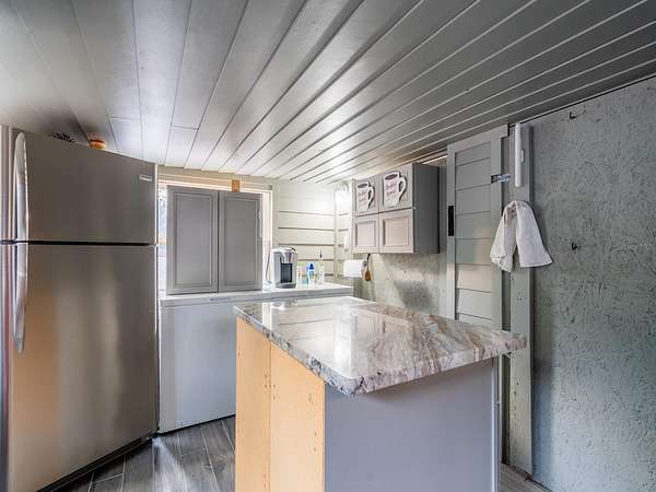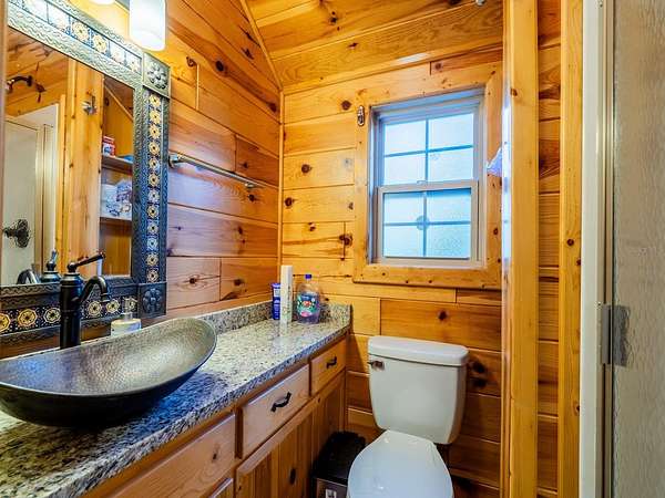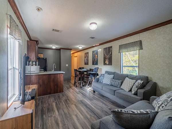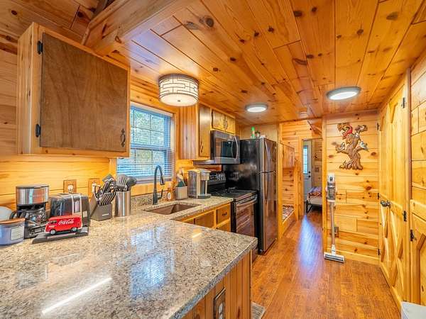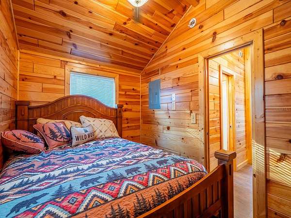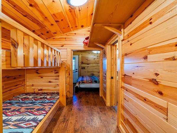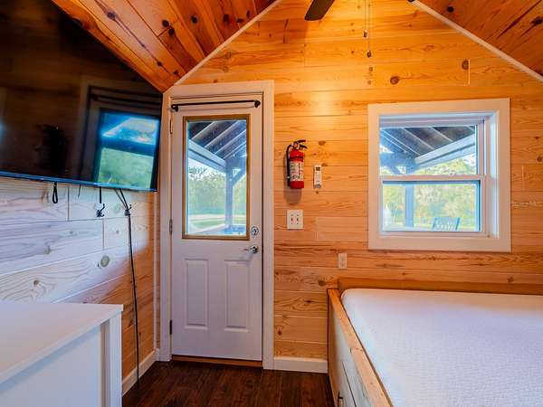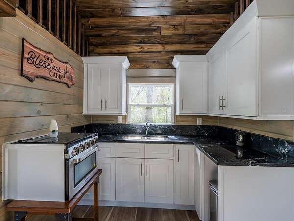 The property features six fully furnished cabins, five completed in 2022 and a cabin in the woods completed in 2024. Cabin 1 (Main Cabin) offers 2 bedrooms and 2 baths in a split floor plan (approx. 844 SF) with vinyl and laminate flooring, full kitchen with wood cabinets and hard-surface countertops, and a 24'x20' deck overlooking the pond with paver parking. Cabin 2 includes 2 bedrooms, 1 bath with loft sleeping area (approx. 385 SF), full kitchen with wood cabinets and solid-surface countertops, hall bunk beds, and front and rear decks overlooking the pond. Cabin 3 features 2 bedrooms, 1 bath with loft sleeping area, full kitchen with wood cabinets and solid-surface countertops, hall bunk beds, fireplace, laundry, and decks overlooking the pond. Cabin 4 offers 1 bedroom, 1 bath with hall bunk beds (approx. 297 SF), wood cabinets, Formica countertops, and a 12'x15' front deck with wheelchair ramp overlooking the Rainbow playground system. Cabin 5 features 2 bedrooms and 2 baths in a split floor plan (approx. 742 SF) with laminate flooring, full kitchen with wood cabinets and hard-surface countertops, laundry, a 16'x16' deck overlooking the pond, and rear paver patio with forest views. Cabin 6 is a cozy woodland cabin with loft bedroom, 1 bath, open floor plan (approx. 340 SF), compact kitchen with range and oven, compact refrigerator, and screened front porch overlooking the woods.