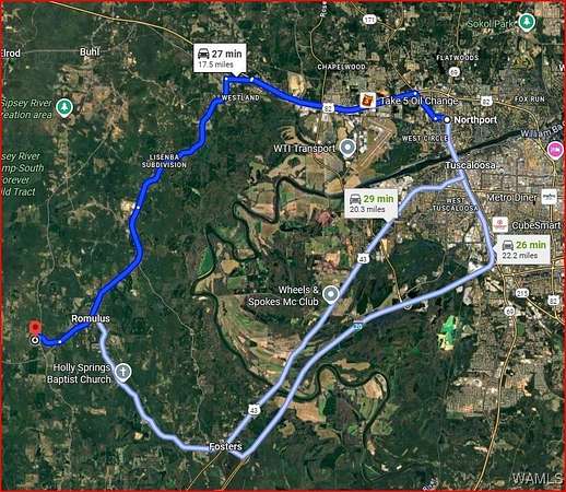 Take hwy 82 to Coker, turn left on co rd 140, turn left on Romulus rd 9.8 mi, turn right on George Hartin rd, then turn left on Sipsey Valley rd, land is on the right.