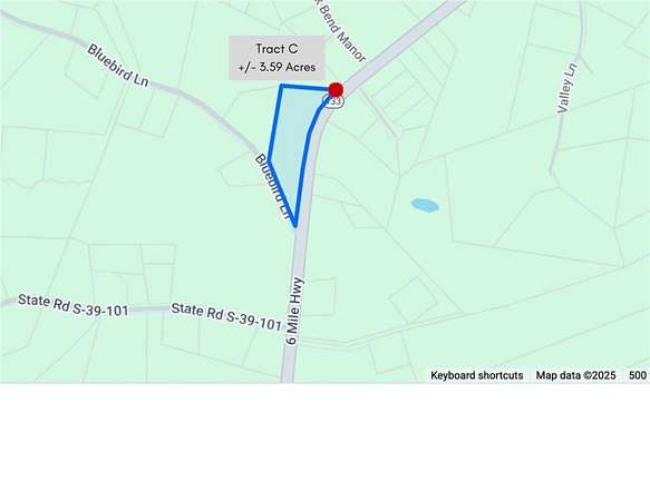 Prime Development Opportunity: Tract C, which is 3.59+/- acres is nestled between Clemson and Six Mile in an area of growth, this tract offers endless potential for visionary investors and developers. The property boasts approximately 883ft of road frontage on Six Mile Highway and 407ft of road frontage on Bluebird Lane. Currently part of a larger 27.54+/- acre tract, this property has not been surveyed yet therefore the acreage totals are an estimate. Additional acreage is available. Don't miss this rare opportunity-schedule your showing today!