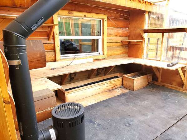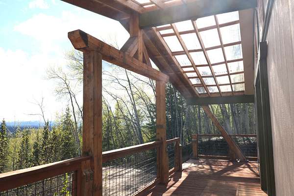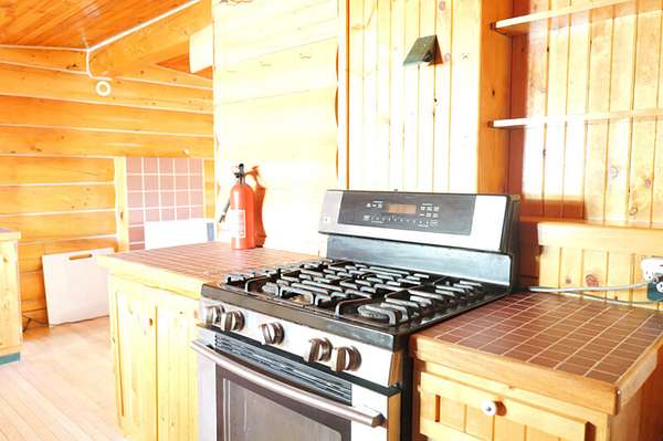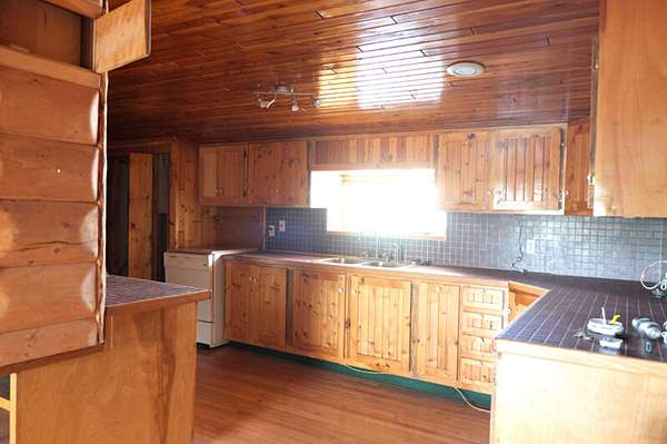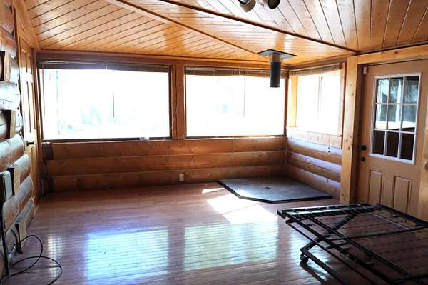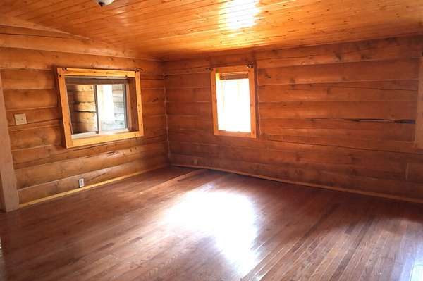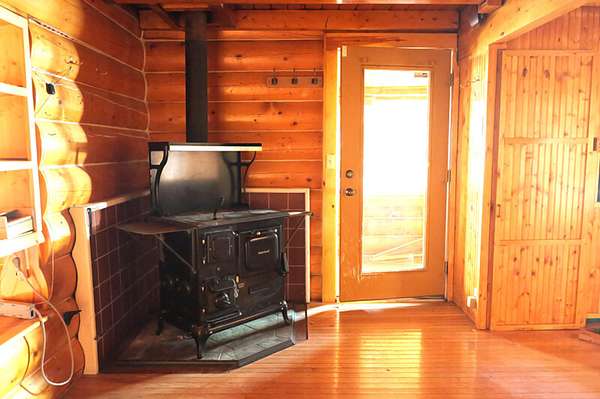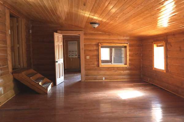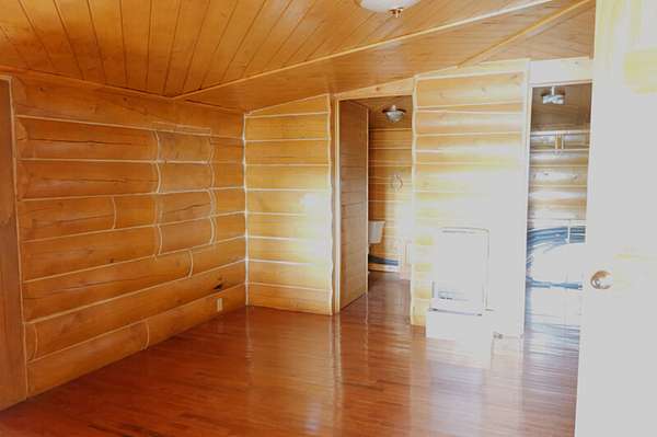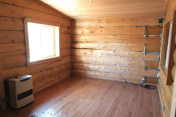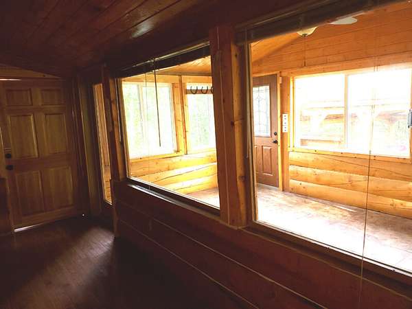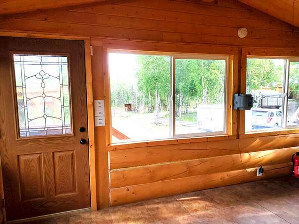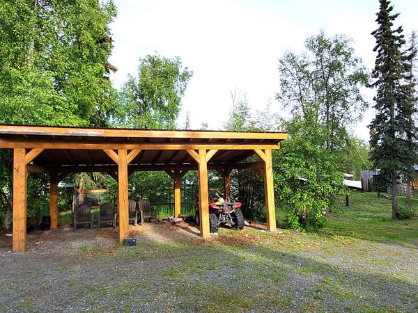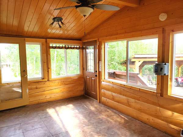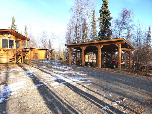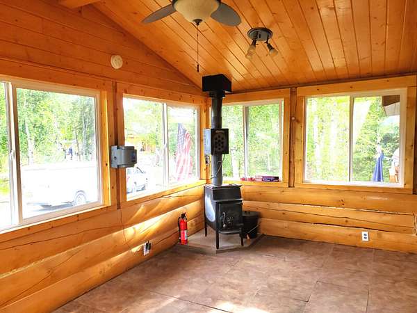 At the heart of the property is a 3,000 square foot handcrafted log home built with 10-inch logs. It features three bedrooms, three bathrooms, a spacious arctic entry, a walk-in closet, and a screened-in porch designed for a hot tub where you can soak while watching the northern lights. The home includes a wood-burning stove for cozy winter nights, a greenhouse added in 2018 for year-round growing, and an attached two-car garage with office space and a lean-to.