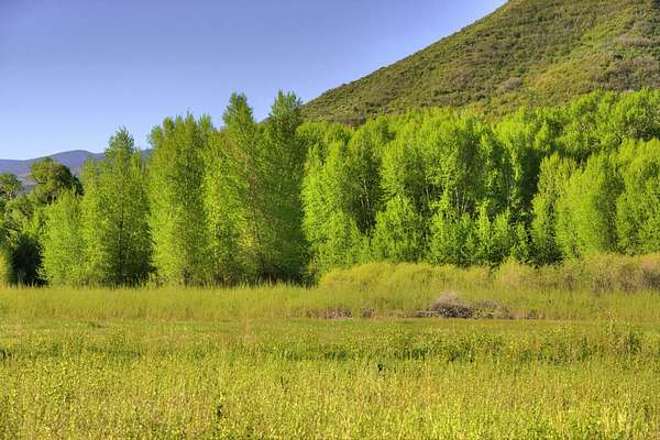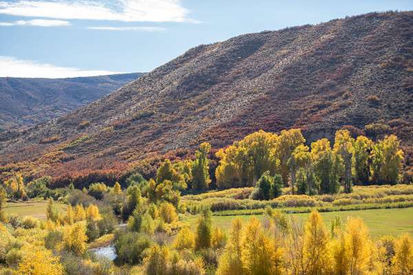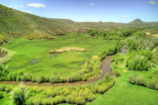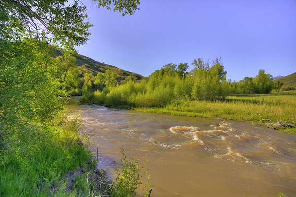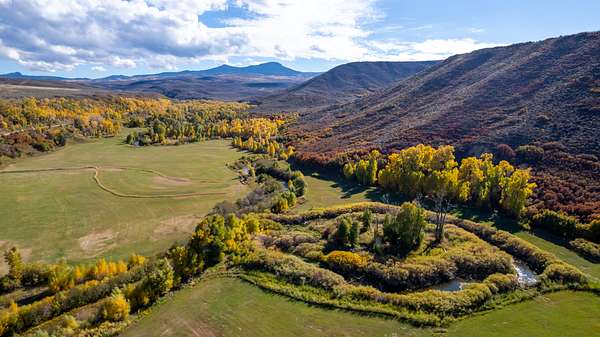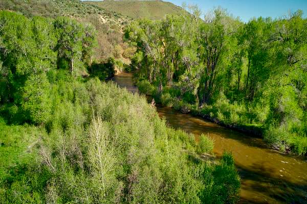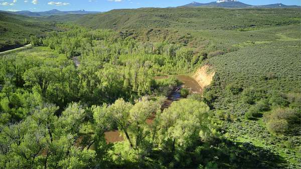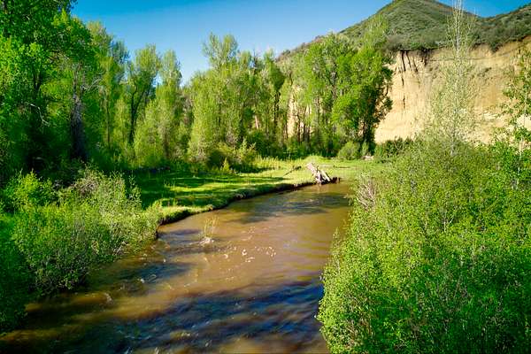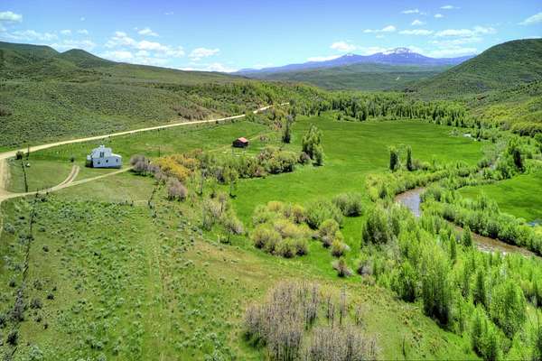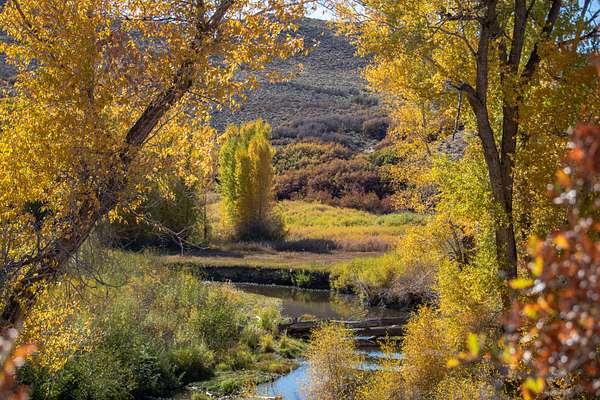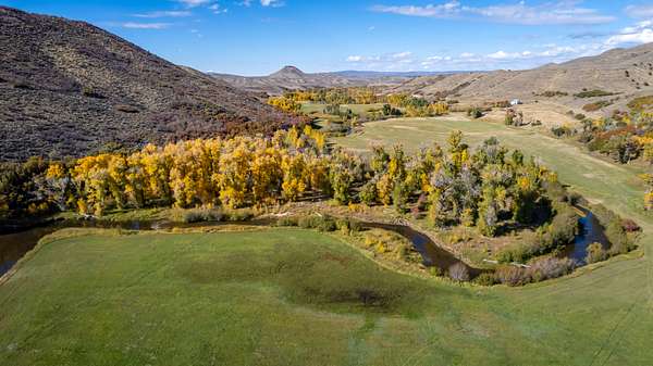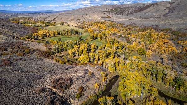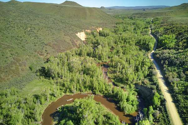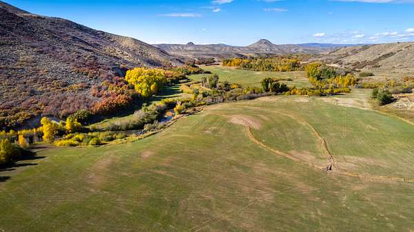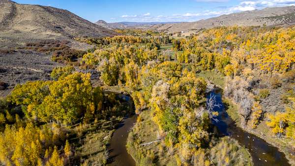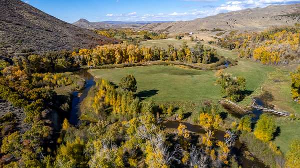 Established in a serene setting, the Klendshoj Ranch combines various landscapes with lush meadows and rich wildlife habitat. The ranch features approximately 60 +/- acres of irrigated meadows, bordered by a vibrant mix of cottonwood, aspen, and willow trees along the winding Slater Creek. The creek, winding over 3 miles, is an excellent trout stream, home to Brooke Trout and Cutthroat Trout. Overlooking the creek bottom are ridges and benches adorned with oak brush, serviceberry, and sagebrush, providing a natural backdrop for the ranch's tranquil atmosphere.