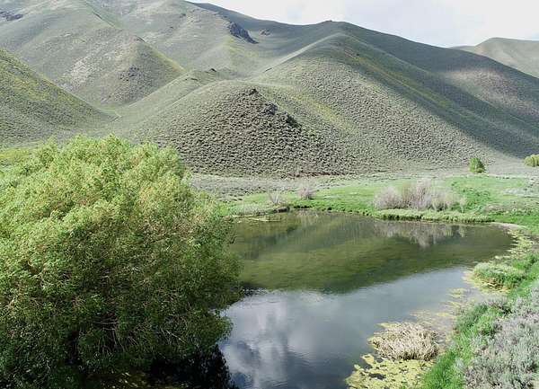 Go east of Bellevue to Slaughterhouse Canyon and take the road to the north of Strahorn Development. Drive out the canyon 2.1 miles and you will come across the garage and pond.