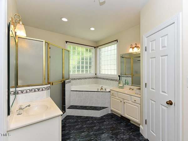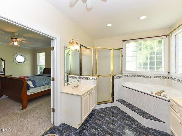 - Bathtub/Shower Combination, Ceiling Fan(s), Double Vanity, Eat-In Kitchen, Kitchen Island, Kitchen/Dining Room Combination, Laminate Counters, Primary Downstairs, Separate Shower, Soaking Tub, Walk-In Closet(s), Whirlpool Tub