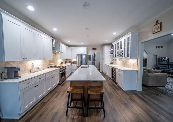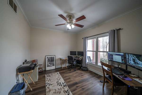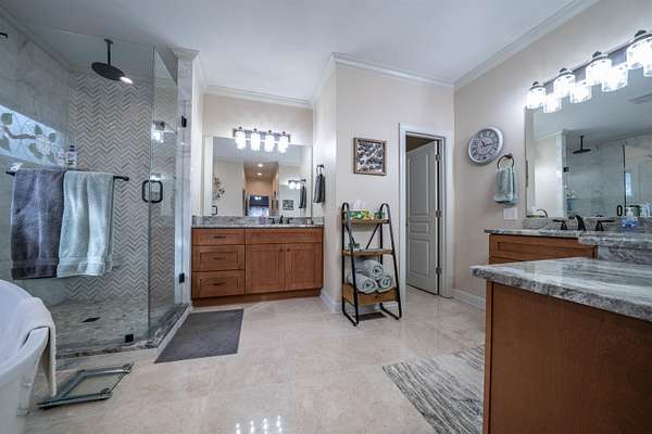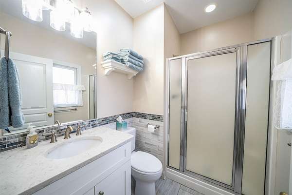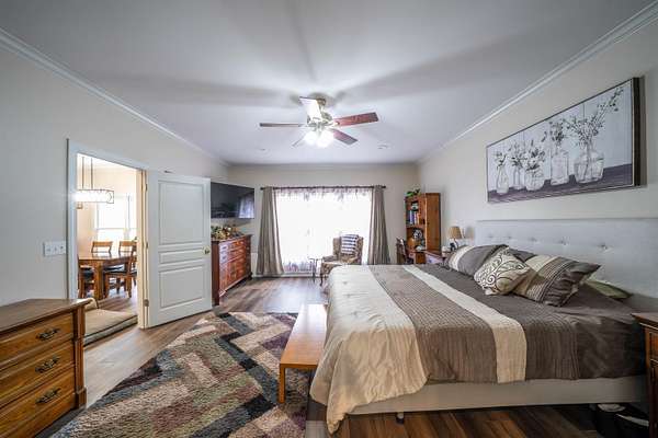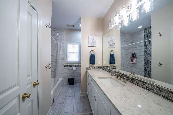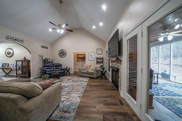 Beautiful brick home on 2 acres had a complete interior remodel with in and out painted in 2023. 2024 Roof, 2024 HVAC, 2022 2 hot water tanks. 2025 Drive repaved and sealed. Bathrooms have all new floors, tile, cabinets, granite, fixtures. Main bath soaking tub and tile shower. Luxury vinyl tile down, smooth ceilings, light fixtures. Kitchen cabinets & quartz tops, stainless appliances and gas range. All bedrooms are en-suite bath for privacy and convenience. Main bedroom closets shelving system. Half bath off the kitchen. Features an enclosed dining room that can serve as that or a great office with front facing windows. There is a large carpeted bonus room and lots of walk in floored attic space. The home has many walk-in and spacious closets, including a double closet in the garage. Out back is private screened porch, chainlink fenced yard, and includes a she-shed with it's own porch. 32x24 workshop with parking. Located in the neighborhood of Woodbridge, it is a pearl of a find.
