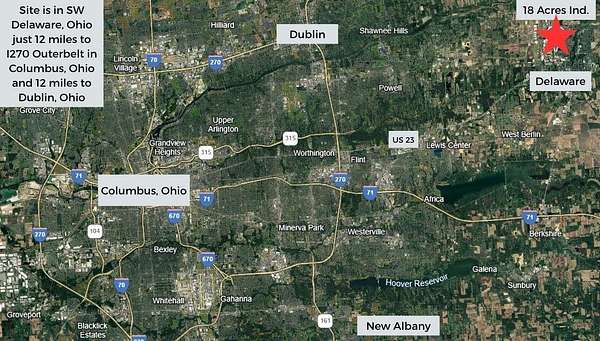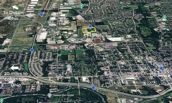 Development opportunity located within a Planned Industrial District of Delaware! 18 acres land across 7 parcels located near Buckeye Ready-Mix Concrete with convenient access to downtown Delaware and the airport. The property includes a dedicated roadway right-of-way for future public roads, making it well-suited for an industrial park or other industrial use. Electric and water are already on the property, with sewer access nearby (buyer to verify). This site offers excellent potential for logistics, distribution, manufacturing, or other industrial uses in a growing market. Buyer to conduct their own due diligence on zoning and utilities.