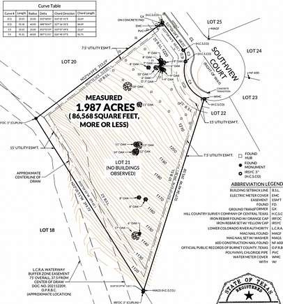 Take 1431 from Marble Falls toward Kingsland, turn right on Mill Creek Rd, turn left on Cedar Ridge Trail to the gate (will need gate code), Cedar Ridge becomes Big Creek Dr., turn right on High Ridge, go past the clubhouse , turn right on Southview Ct. Lot 21 is the third lot on the right.