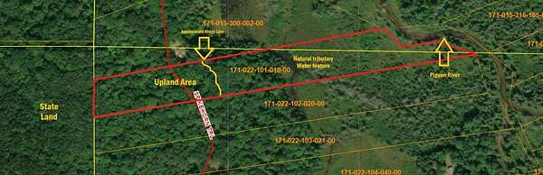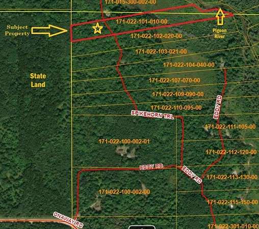 Discover the beauty and serenity of this 10-acre wooded retreat, perfectly situated along the picturesque Pigeon River and adjacent to expansive state land. This peaceful haven, ideal for nature lovers, hunters, or those dreaming of a tranquil Up North getaway. The included shed is perched on a ridge offering breathtaking views of a natural, tributary water feature that meanders gracefully to the river below. Whether you're envisioning a private hunting escape, a rustic cabin, or your forever home in the woods, this property offers limitless potential. Located just minutes from Indian River, you'll have convenient access to shopping, dining, and essential amenities, while still enjoying the seclusion and calm of pure Northern Michigan wilderness.