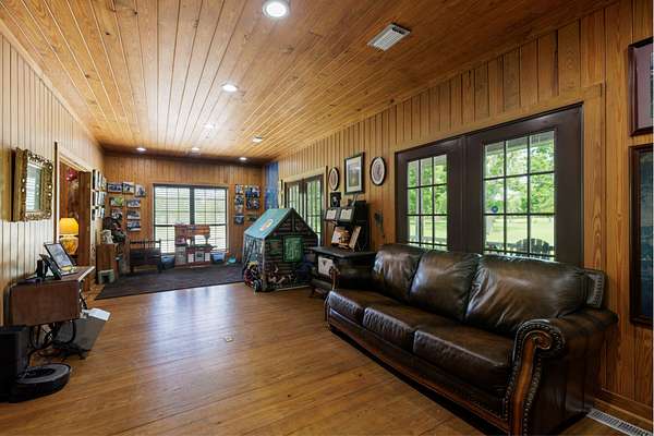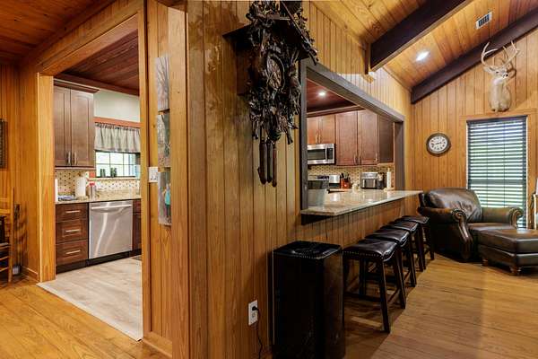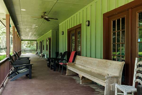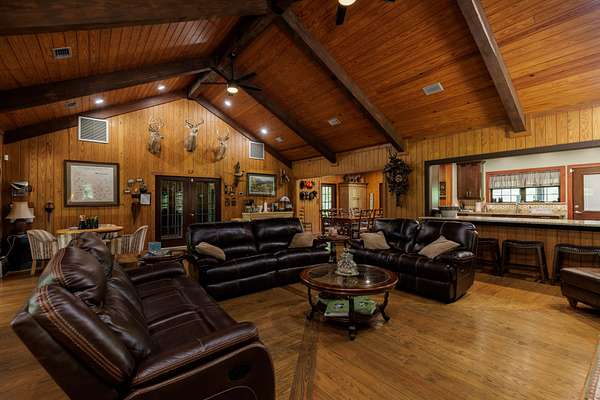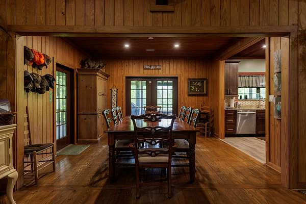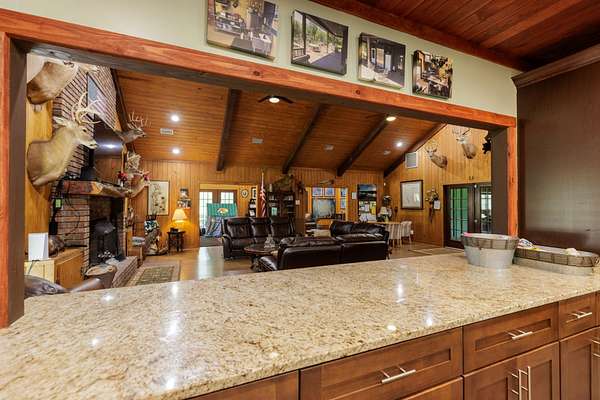The Lodge has an open plan with the vaulted and beamed great room, featuring a floor to ceiling fireplace, kitchen, dining room and gathering room all open to accommodate that large family or lots of company and complete with furniture and furnishings. With 7 bedrooms, 8 baths, an office and a basement there is room for everyone. Sit outside on the back screen porch or in the rocking chairs on the front open porch. Covered parking and a back up generator also included.