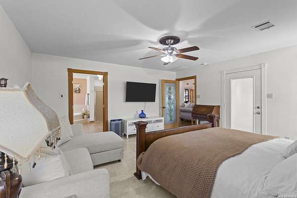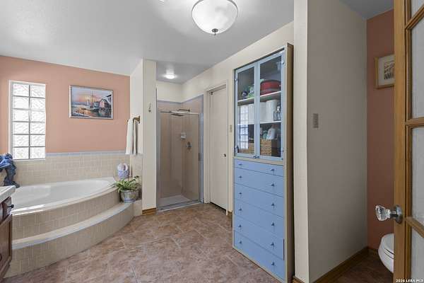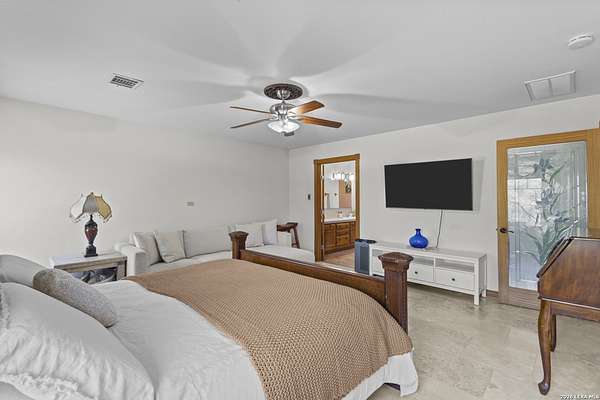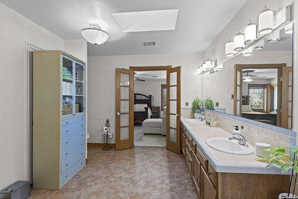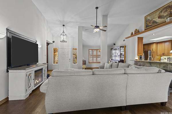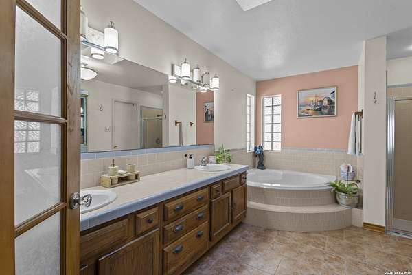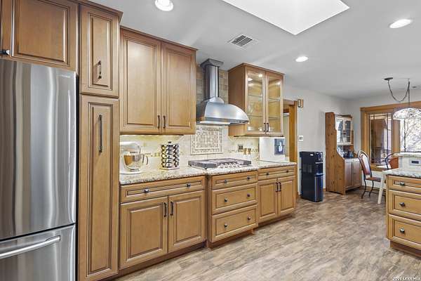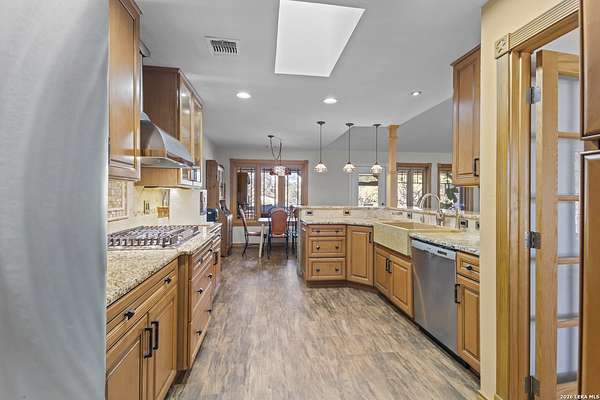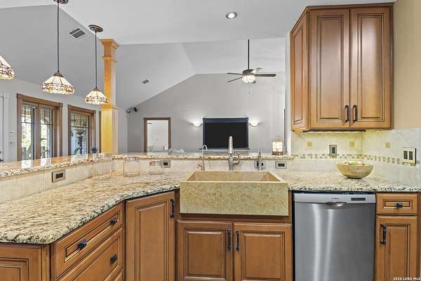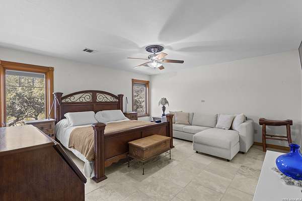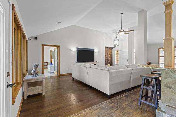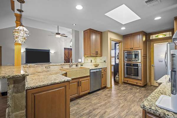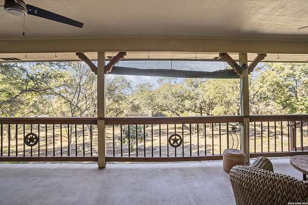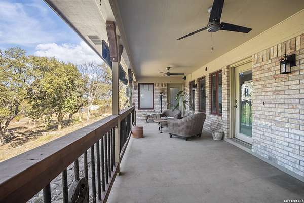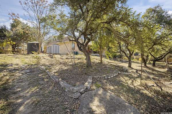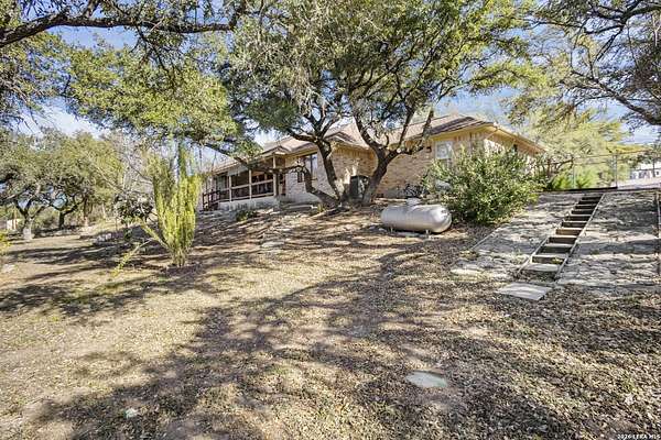 Welcome to your dream home! A stunning country-style Tilson residence that perfectly combines rustic charm with modern convenience. Nestled on 2.18 acres of picturesque land, this property offers a breathtaking country view and endless opportunities for relaxation and entertainment. The ceramic tile entryway invites you in, while the high ceilings and open space concept create an airy and welcoming atmosphere. Enjoy the blend of hickory wood, stone and ceramic flooring adding a touch of natural beauty to each room. The pantry and kitchen feature custom Cordell cabinets that provide ample storage space, beautiful granite countertops and sink, elegant Tiffany-Style chandeliers and skylights illuminate the space. Home includes Pella TRIPLE pane windows, complete with built-in screens and blinds. A beautiful retaining wall out front enhances the curb appeal, while a flagstone sidewalk guides you to the entrance. Enjoy the convenience of a 1-acre fully fenced-in area, complete with a heavy-duty custom front fence and two large entry gates for added security and privacy. For those with an RV, the electrical and waste hookup is a valuable addition, making travel preparations a breeze. The property also boasts a two-story garage/workshop. Located on a quiet cul-de-sac, this home is just a 25-minute drive from San Antonio, New Braunfels, or Canyon Lake, providing easy access to city amenities while maintaining a peaceful, country lifestyle. Enjoy the convenience of being minutes away from The District on 46, offering local shopping and dining options. This country retreat embodies the perfect blend of rustic charm and modern amenities.