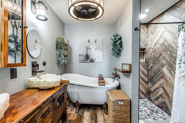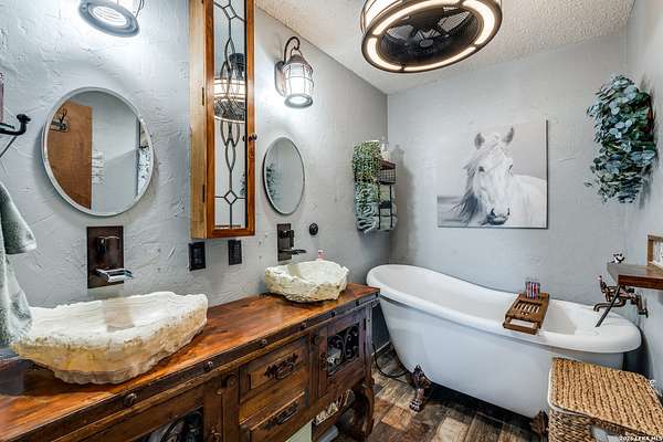 Peaceful country living with breathtaking Hill Country views - just minutes from city conveniences!! Situated on two lots totaling 1.5 acres, this classic ranch-style homestead offers privacy, space, and versatility. Fully fenced with an automatic gate, it's perfectly suited for a mini-farm, hobby ranch, or quiet rural retreat. Inside, the thoughtfully designed split floor plan features updated flooring and fixtures, granite countertops, new stainless steel appliances, and a durable metal roof - blending timeless character with modern updates. Step outside to enjoy true Texas outdoor living. Relax in the saltwater pool, soak in the Texas-sized hot tub, or take in sweeping views from the expansive, north-facing front porch. The air-conditioned, plumbed garage/workshop provides ample storage and workspace for projects, equipment, or hobbies. Additional features include a barn with chicken run, greenhouse, private well, RV hookups, and a firepit - offering endless opportunities for entertaining, relaxing, and enjoying the land. Horses are allowed, and high-speed internet is available. If you're looking for wide-open space, stunning views, and a peaceful lifestyle without sacrificing convenience, this property delivers!