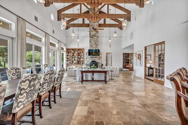 An exceptional opportunity in The Peninsula at Mystic Shores, this 6 acre waterfront property offers rare privacy, sweeping lake views, and direct access to Canyon Lake. W/ 1200+linear feet of combined main shoreline and cove frontage (buyer to verify), plus a private on-site boat launch/ramp, this residence is positioned for an elevated Hill Country lake lifestyle. The home features 24ft beamed ceilings, expansive windows, and an open layout filled w/ natural light. The kitchen includes custom cabinetry, double ovens & seamless flow to both casual & formal dining areas. Outdoor living includes a full kitchen, fireplace, and generous covered spaces designed for year-round enjoyment. The primary suite includes a stone-clad fireplace, spa inspired bath & panoramic water vistas. 2 main level offices provide functional flexibility, while the upstairs media & game room w/ wet bar offer ideal spaces for recreation & hosting. Outside, an infinity-edge pool w/ rock waterfalls overlooks a gently sloping lawn leading toward the shoreline. Additional features include an attached 4 car garage w/a covered boat bay & workshop, a private irrigation well & high-speed internet. Ownership in Mystic Shores includes access to a 26 acre lakefront park, resort-style pool, tennis & pickleball courts, sand volleyball, trails & more. An adjacent 4 acre waterfront tract is also available offering increased shoreline, enhanced privacy & future possibilities for guest accommodations or additional amenities. Call agent for details
