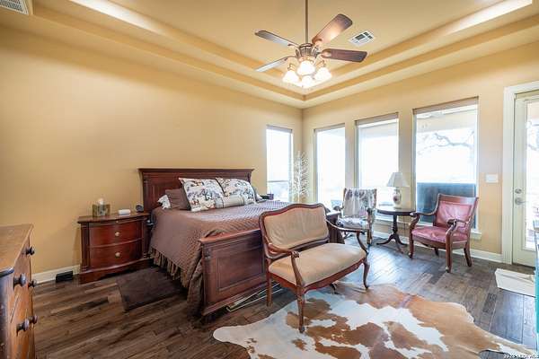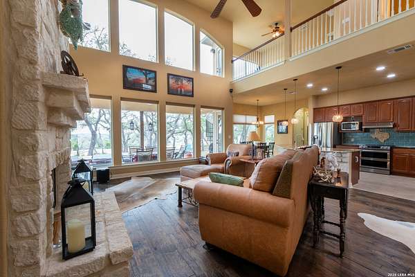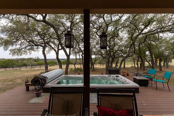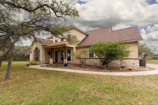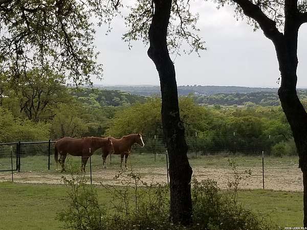 This Hill Country view home in Mystic Shores at Canyon Lake sits on 12.33 acres and offers space, privacy, and unobstructed backyard hill country views. 1041 Mystic Breeze is a 3 bedroom, 2.5 bath home that features a formal dining room, dedicated office, and an open loft that provides flexible living or creative space. The kitchen offers plenty of room with a smart oven, new dishwasher, island and breakfast nook. The oversized primary suite downstairs includes a spa like bath with an antique freestanding soaking tub featuring 24 carat gold feet and handles, creating a true retreat. A rock fireplace anchors the main living area, adding warmth and classic Hill Country character. Enjoy outdoor living from the covered patio and balcony overlooking surrounding wildlife and sweeping Hill Country views. The property is fully perimeter fenced and cross fenced and includes a two-stall horse barn, making it ideal for equestrian use or those seeking a rural lifestyle. An in-ground swim spa provides year-round relaxation and exercise. For those seeking less acreage, this property maybe bought with just the rear adjoining 3 acre tract available (552 Rock Trail Pl) for $909,900 total for 7.81 acres, or the neighboring 4.52 acre homesite available (1035 Mystic Breeze) for $974,900 total for 9.33 acres.