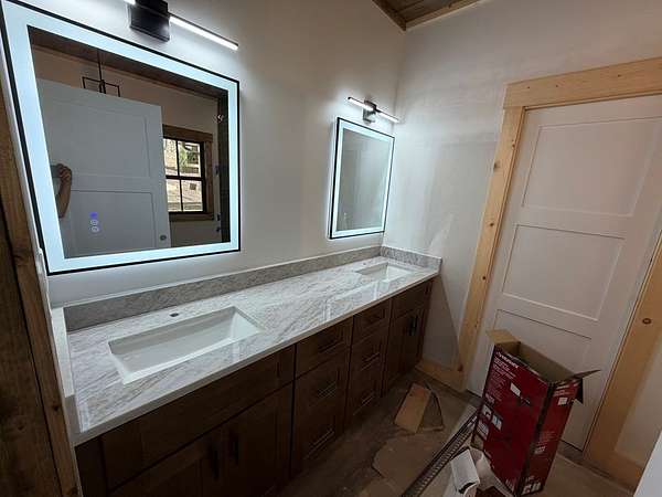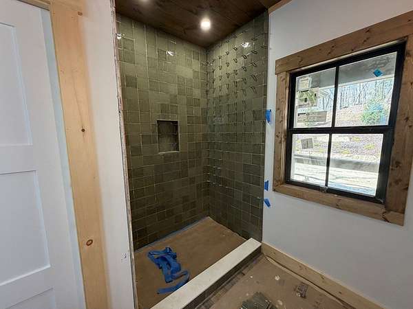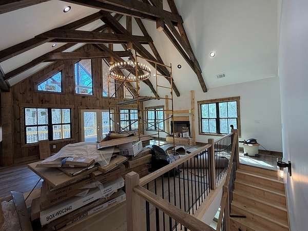 CREEK FRONT + TOCCOA RIVER ACCESS... To be completed within a week! Just 6 minutes from downtown Blue Ridge and Old Toccoa Farm, this stunning 3,100sqft, new construction offers the perfect balance of privacy and convenience. Set on 4 private acres in a gated community, a peaceful creek winds through the property, with exclusive access to the Toccoa River for fishing and kayaking. Designed with modern rustic style, the home features striking gables, exposed beams, and a seamless blend of wood and drywall. The open main level includes a spacious great room with a stone fireplace, a chef's kitchen with quartz countertops and walk-in pantry, a full-size laundry room with cabinetry, and a convenient half bath for guests. The primary suite offers vaulted ceilings with exposed beams, a large walk-in closet, a spa-like bath with both stand alone bath + walk-in glass shower, and a versatile bonus area ideal for a sitting room or home office. The terrace level adds a second living area with a striking wood fireplace, wet bar and two oversized guest suites—each featuring private en-suite baths and walk-in closets. Outdoor living shines with upper and lower porches overlooking the creek—perfect for relaxing or entertaining. You can also enjoy the fantastic, newly and professionally installed landscaping. Ideal as a full-time home, luxury getaway, or income-producing rental, this property captures the best of North Georgia mountain living.
