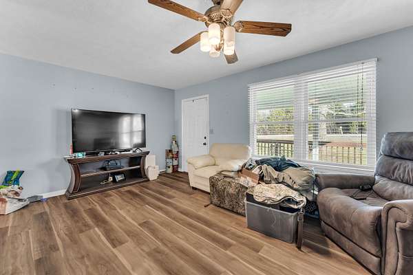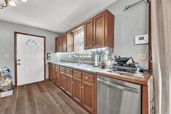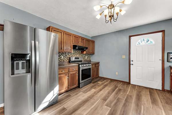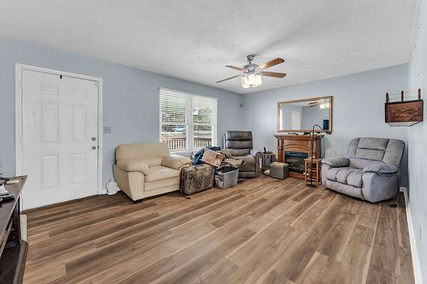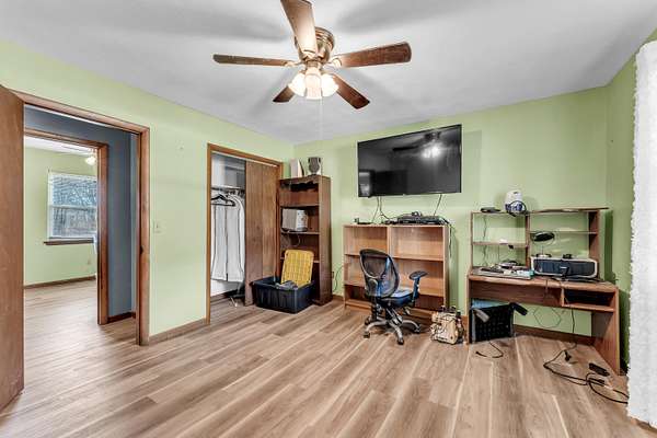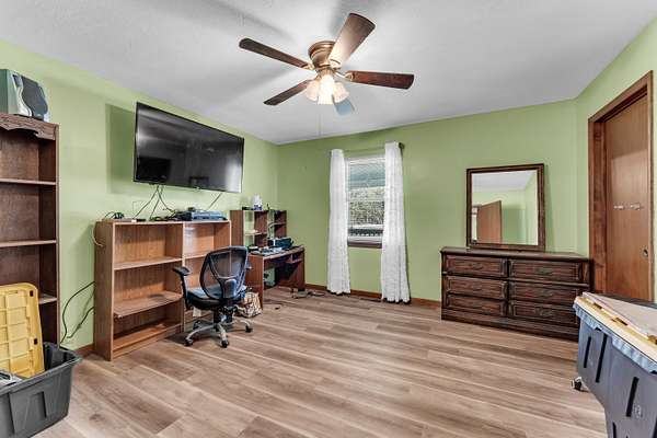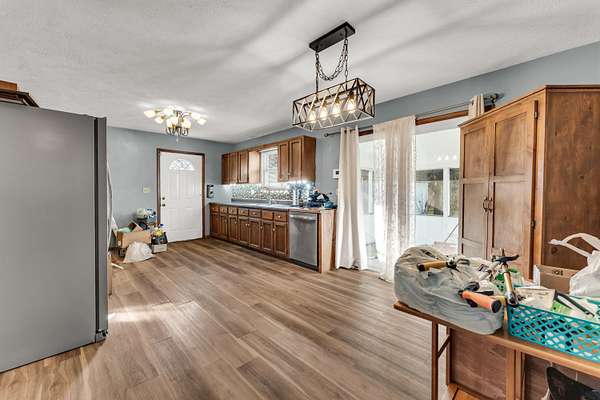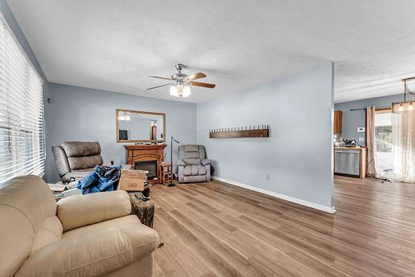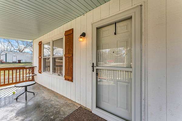 Nestled on 5 mostly wooded acres, this inviting 2-bedroom, 1-bath home offers peaceful country living with practical amenities. A charming front porch welcomes you inside, where you'll find durable vinyl plank flooring throughout the home. The eat-in kitchen is fully equipped with a stainless steel refrigerator, gas stove, and dishwasher, providing both comfort and convenience. The bathroom features a walk-in tub/shower, offering ease of use and accessibility. The thoughtful layout makes this home both cozy and functional. Outside, enjoy the added value of an insulated shop with concrete floors and electricity, perfect for projects, storage, or hobbies. Surrounded by mature trees, this 5 acre property delivers privacy, versatility, and the opportunity to enjoy a quieter lifestyle with room to grow. No restrictions. Property being sold as-is.