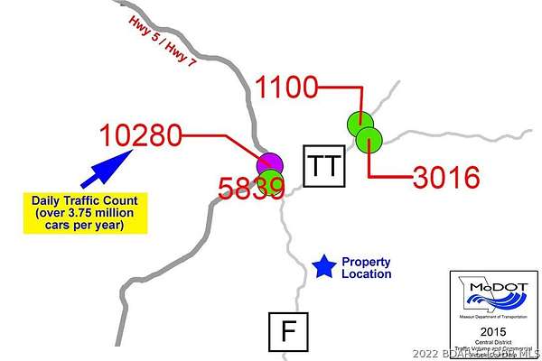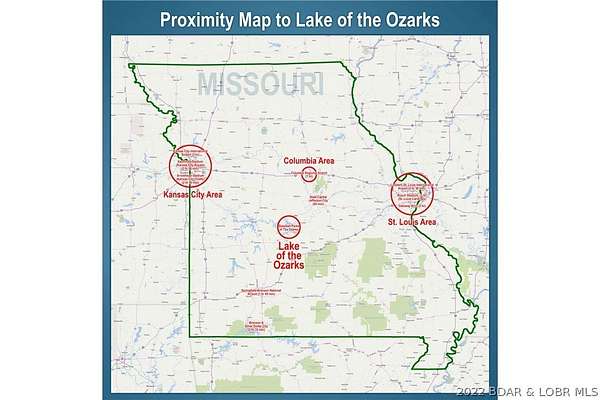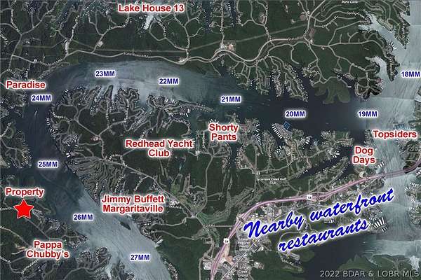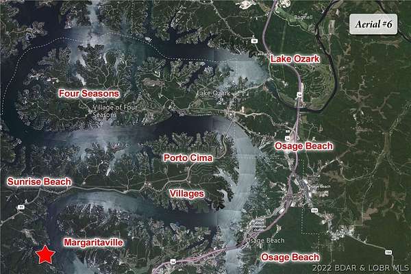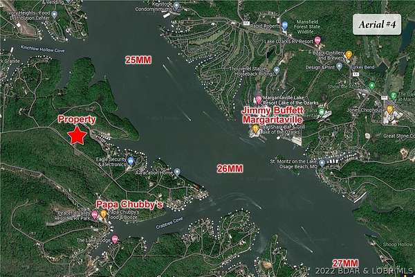 Est $4,788/mo64-acres of property at the 26MM across from Jimmy Buffett Margaritaville. Much of this expansive property has desirable lakeviews. Zoning could be residential, commercial, etc. Meaning endless possibilities with current or alternate zoning. Only minutes from Highway 5. Six (6) parcels make up the 64 contiguous acres surrounding the Ledgestone Estates Subdivision. Close to countless Waterfront Restaurants by road and by water. Highway 5 has over 3.75 million cars per year per MODOT DTC.