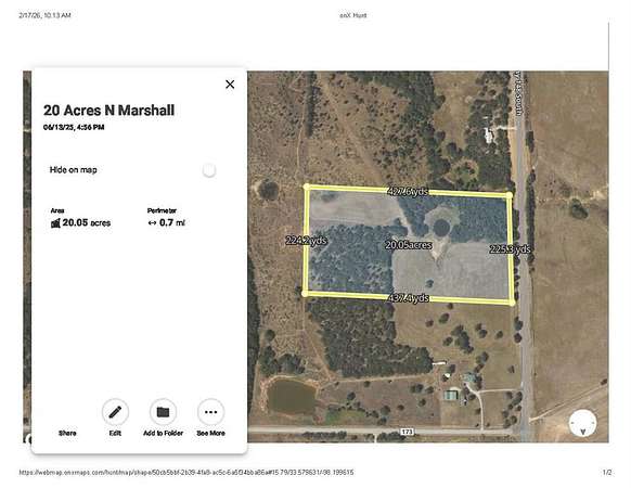 Est $2,450/moMarshall Ranch 20 Acres. Increible rare find!! Everything you want in a small package! Excellent place for a homesite and barns! Super deer hunting. Hay production for livestock. 2 Ponds. Big Oak timber with high elevation & open grass clearings. Paved road frontage and easy commute to Bowie or Henrietta. 45 Minutes to Wichita Falls and 90 minutes to DFW International Airport. Great rural community in Joy with Midway ISD School just down the road. Perfect place to raise a family or retire to the country!