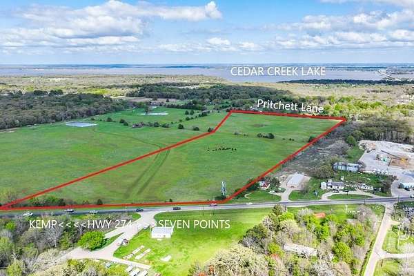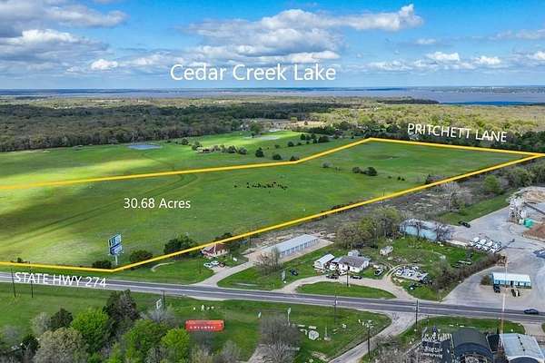 Attention developers! This 30.68-acre property in the City of Seven Points, Henderson County, boasts a level terrain, making it an ideal location for development. Situated just a few minutes from Cedar Creek Lake and offering 900ft of road frontage on HWY 274 with a second access on Pritchett Lane, this property presents an opportunity to establish an RV park, business, or upscale neighborhood with ease. Additionally, the property is located within the City Limits of Seven Points, which offers proximity to shopping amenities and a private neighborhood feel. Currently, the land is being used for hay production, and there is no known flood zones or restrictions. Water supply is available from West Cedar Creek MUD, and power is accessible from Trinity Valley Electric. This prime location awaits your vision and development plans.