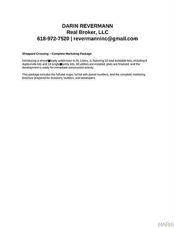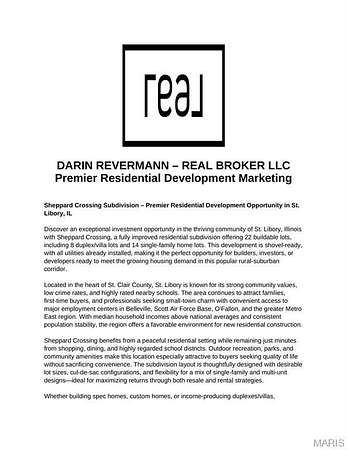 Discover an exceptional investment opportunity in the thriving community of St. Libory, Illinois, with Sheppard Crossing, a fully improved residential subdivision offering 22 buildable lots, including 8 duplex/villa lots and 14 single-family home lots. This development is shovel-ready, with all utilities already installed, making it the perfect opportunity for builders, investors, or developers ready to meet the growing housing demand in this popular rural-suburban corridor.